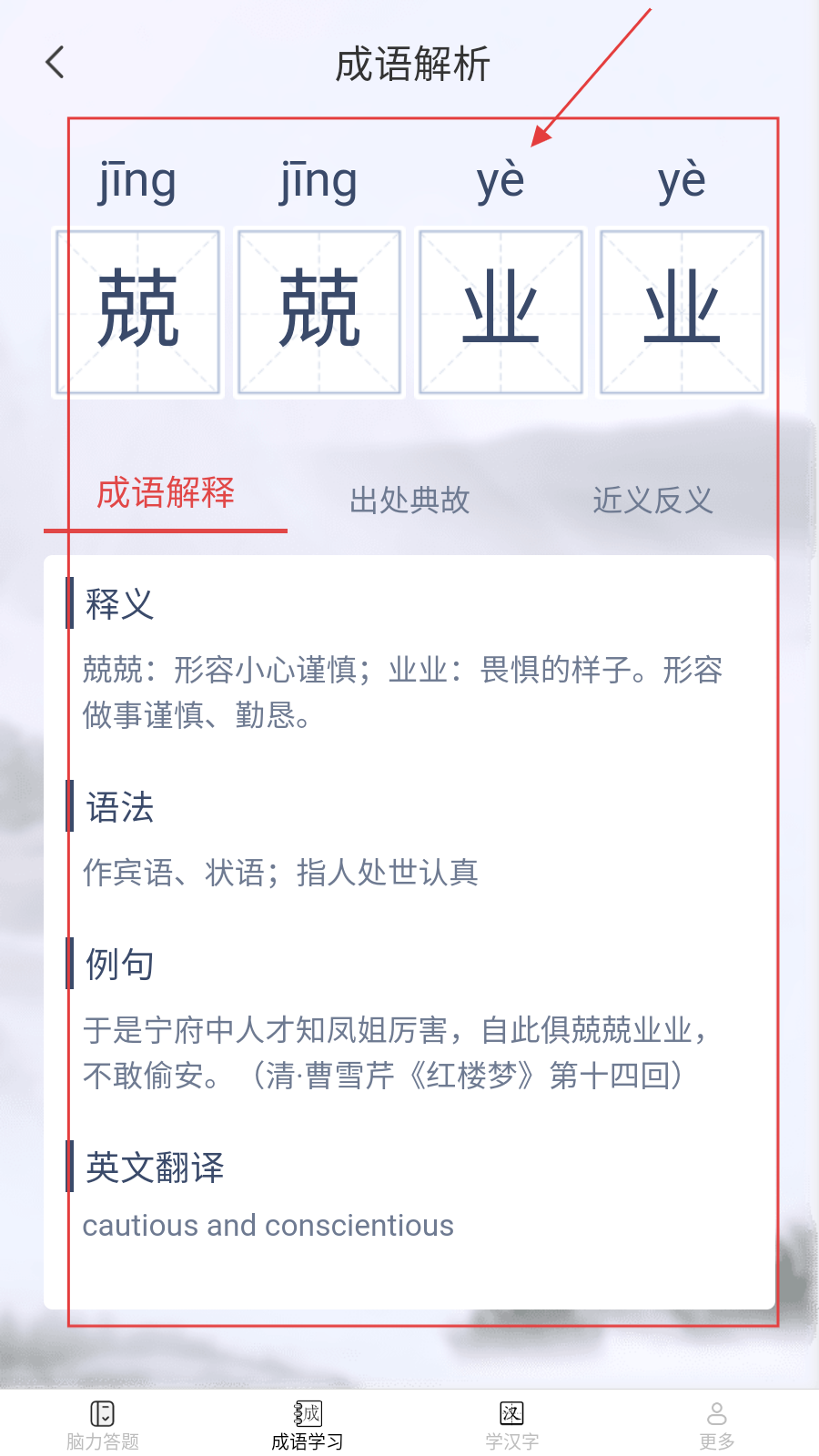 4、点选成语,进入【成语解析】页,查看读音、释义、用法等知识。