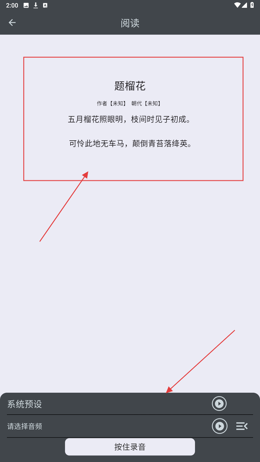 3、阅读古诗时,用底部功能,可录音跟读、选音频听朗诵辅助学习。