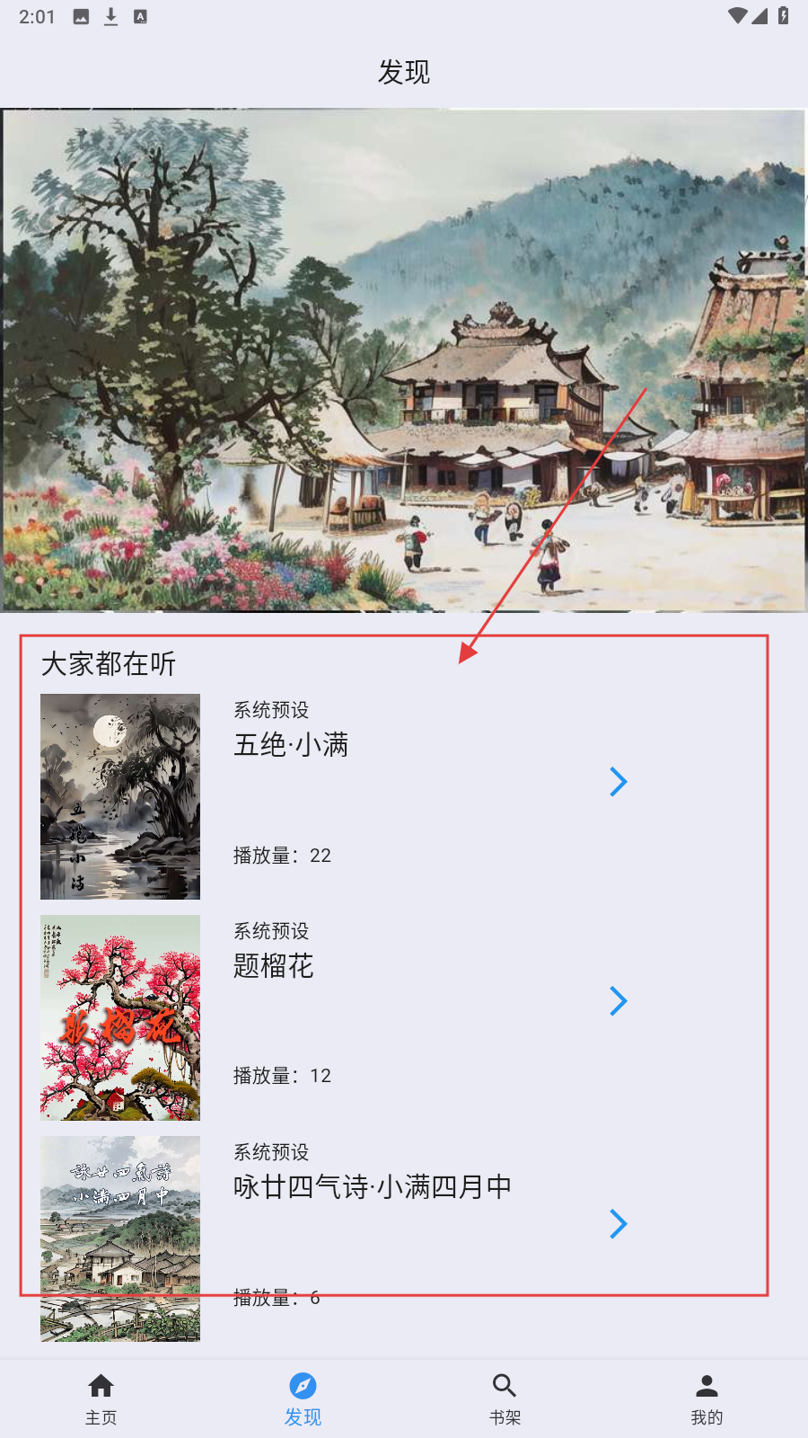 4、切换【发现】,看【大家都在听】,选热门古诗音频,听学结合提升。