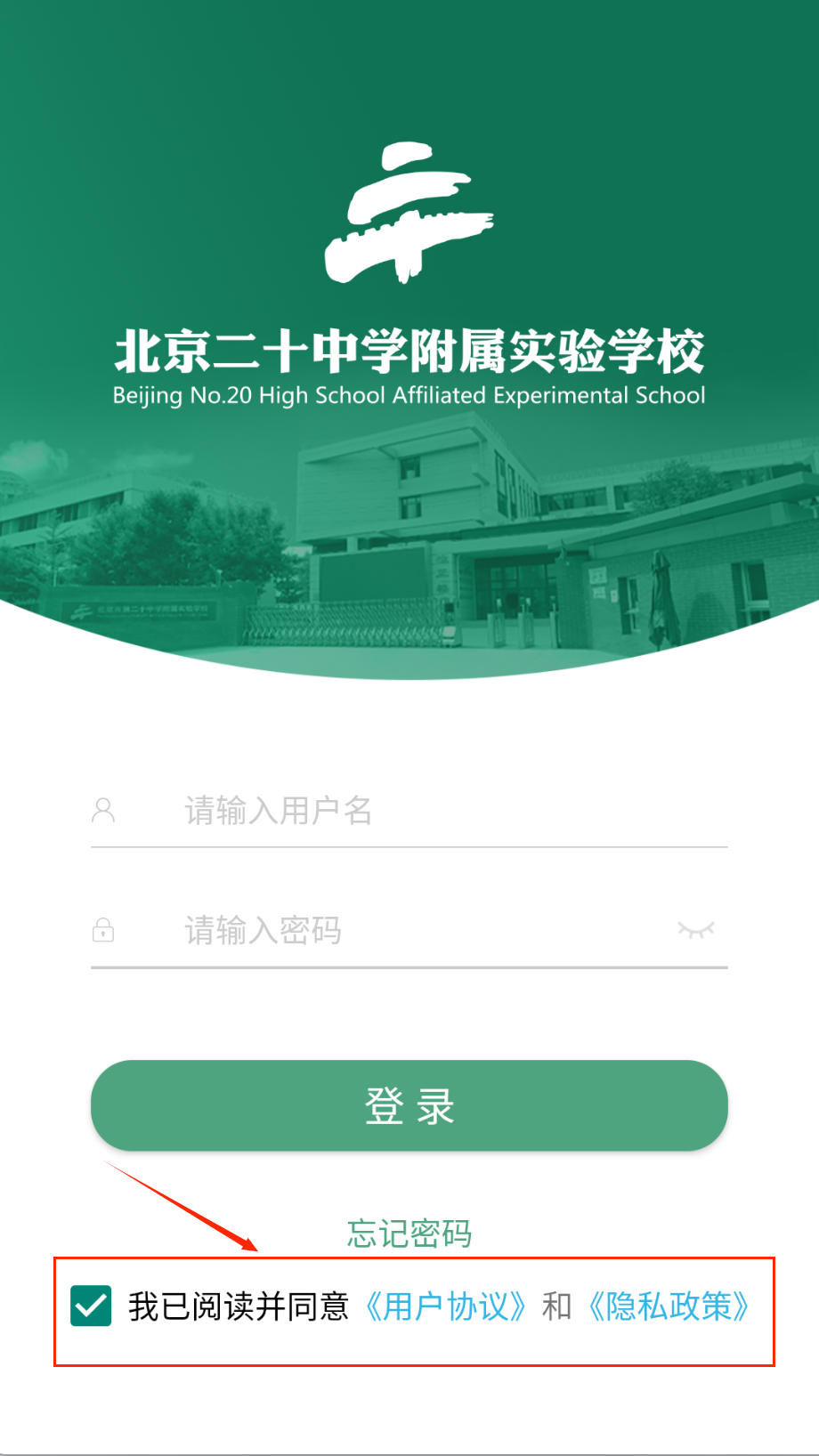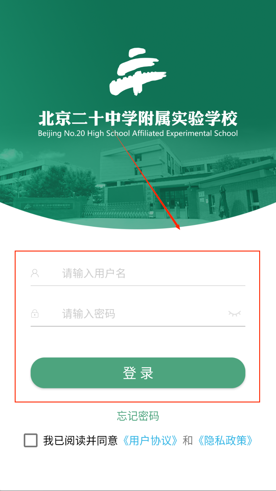 1、打开软件就能看到学校logo和绿色主界面,在下方输入框填写管理员分发的用户名和密码呢。