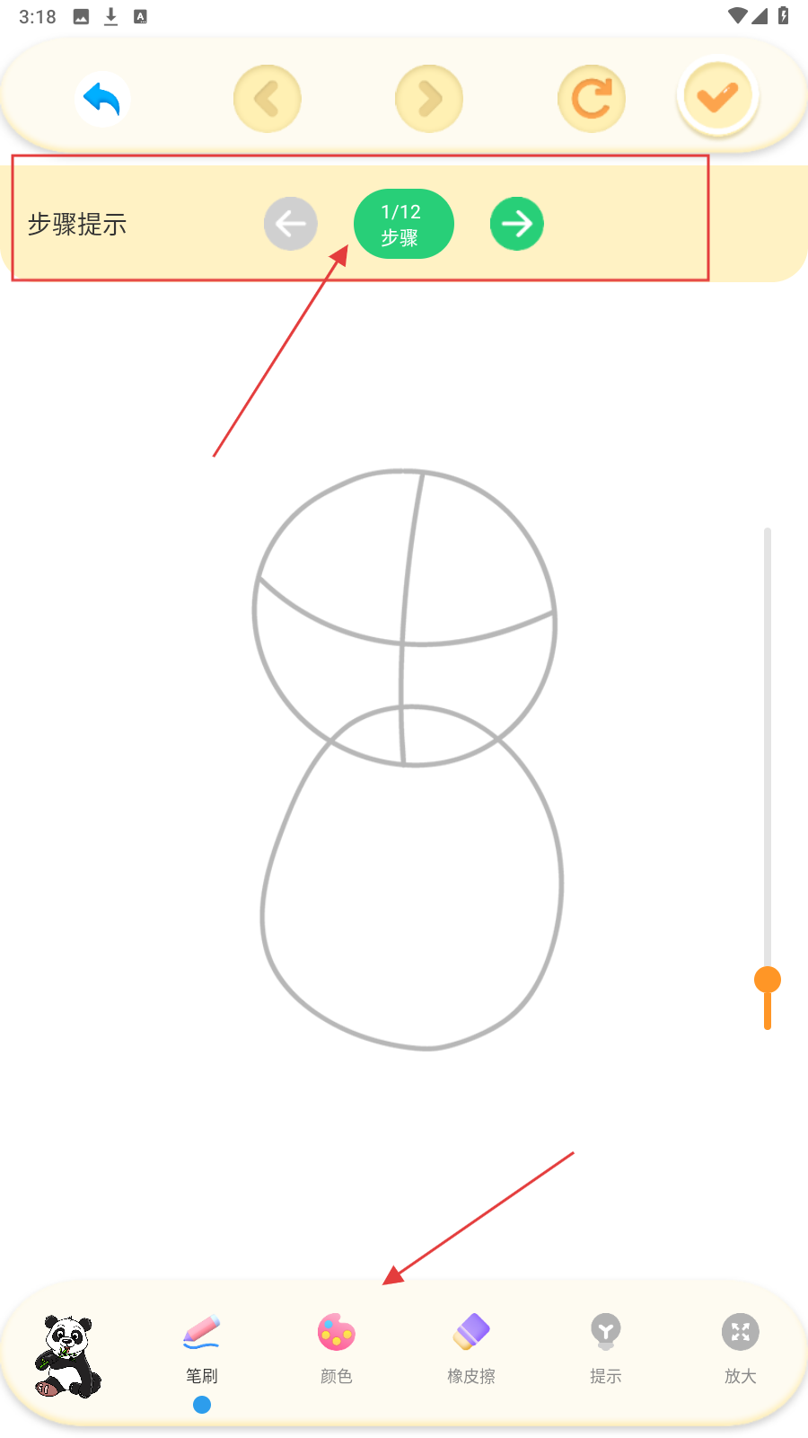 3、绘画页按【步骤提示】(1/12步骤等),用【笔刷】【颜色】工具创作。