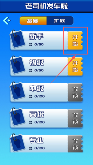 3、等级提升:点击“开始”按钮,提升司机等级,解锁新关卡。