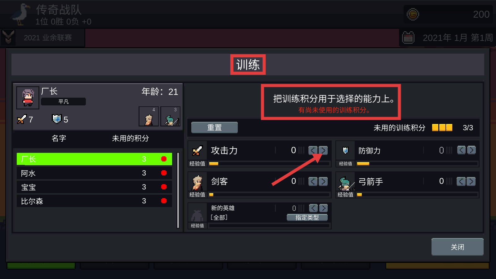 2、进入训练界面,分配积分给选手(如厂长),提升攻击力等属性。