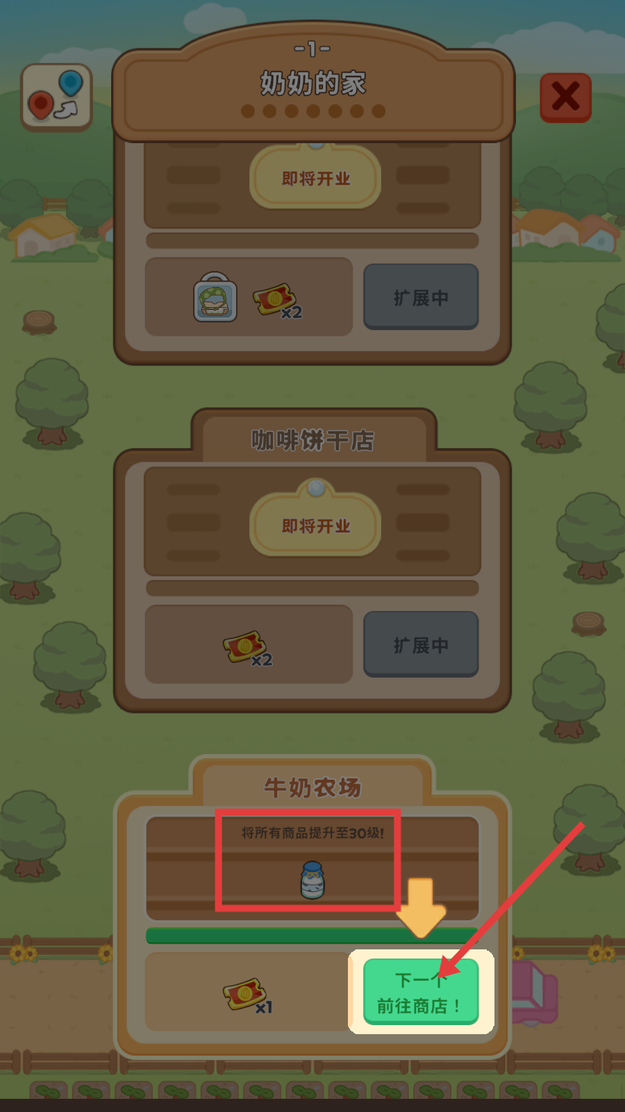 4、达成牛奶农场商品30级,点【下一个前往商店】。