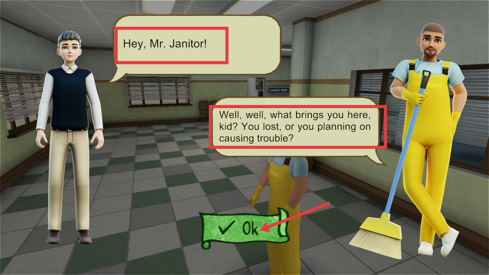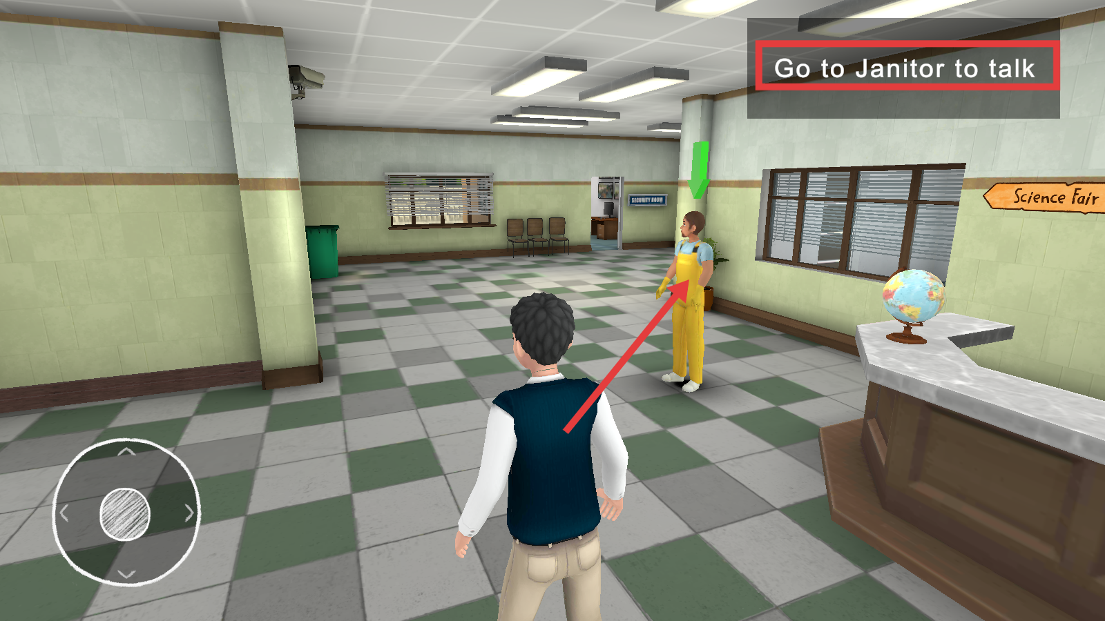 3、入校后找门卫(Janitor)位置,与其交谈。