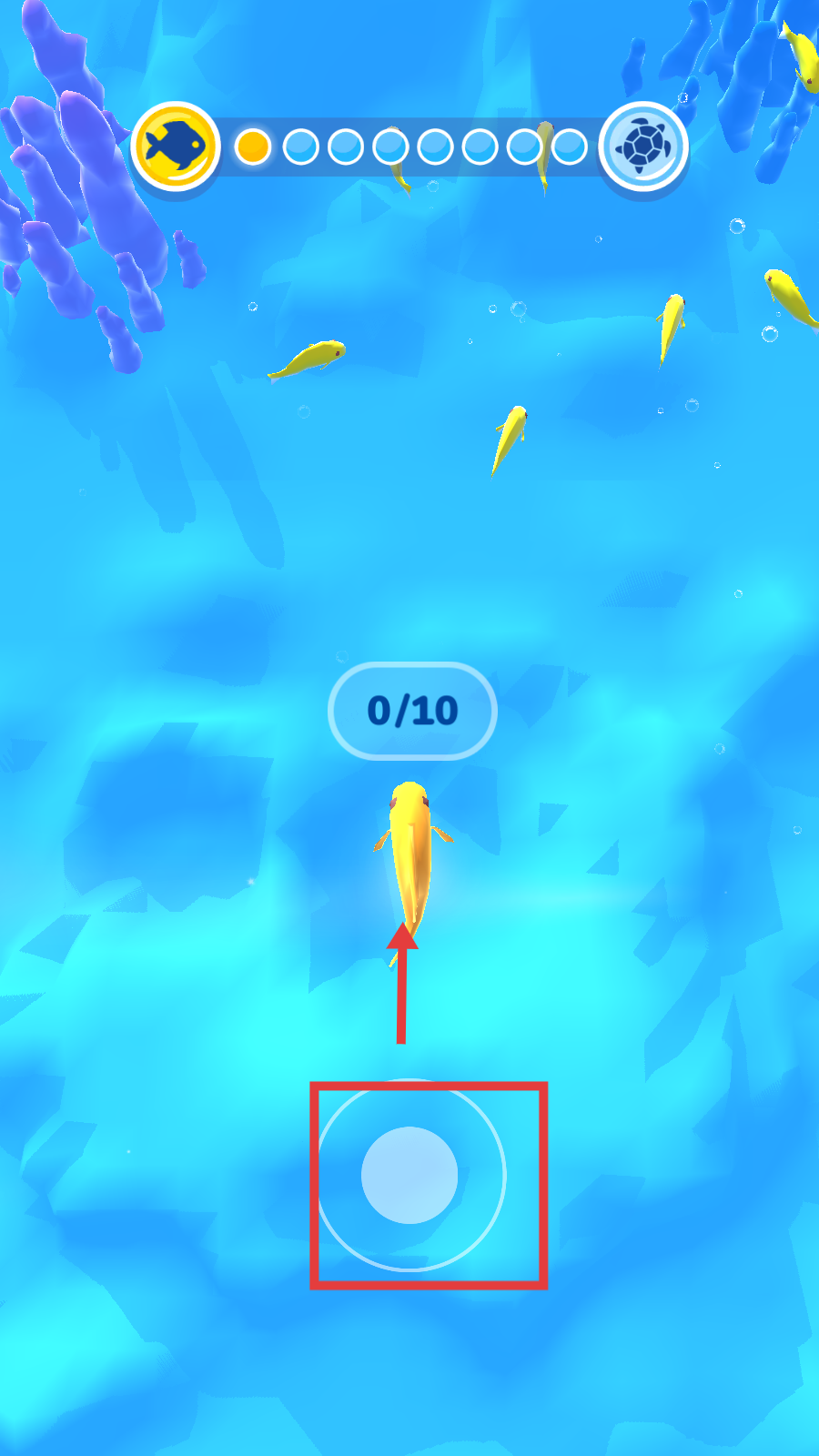 1、操控【黄色小鱼】,点击下方按钮,优先收集同色小鱼,推进【0/10】收集目标。