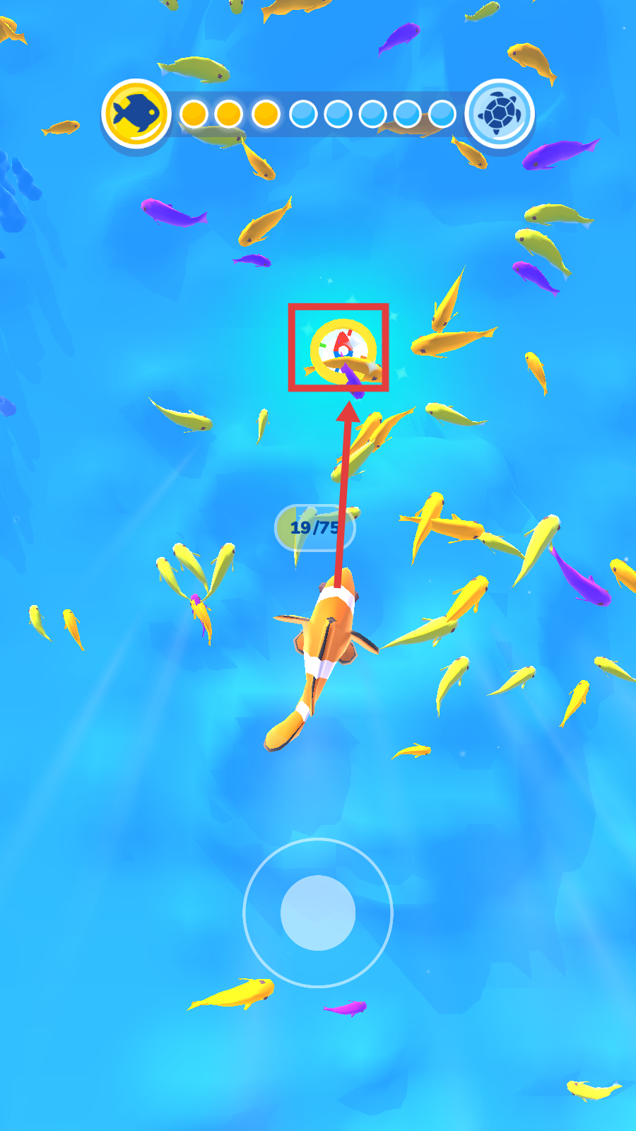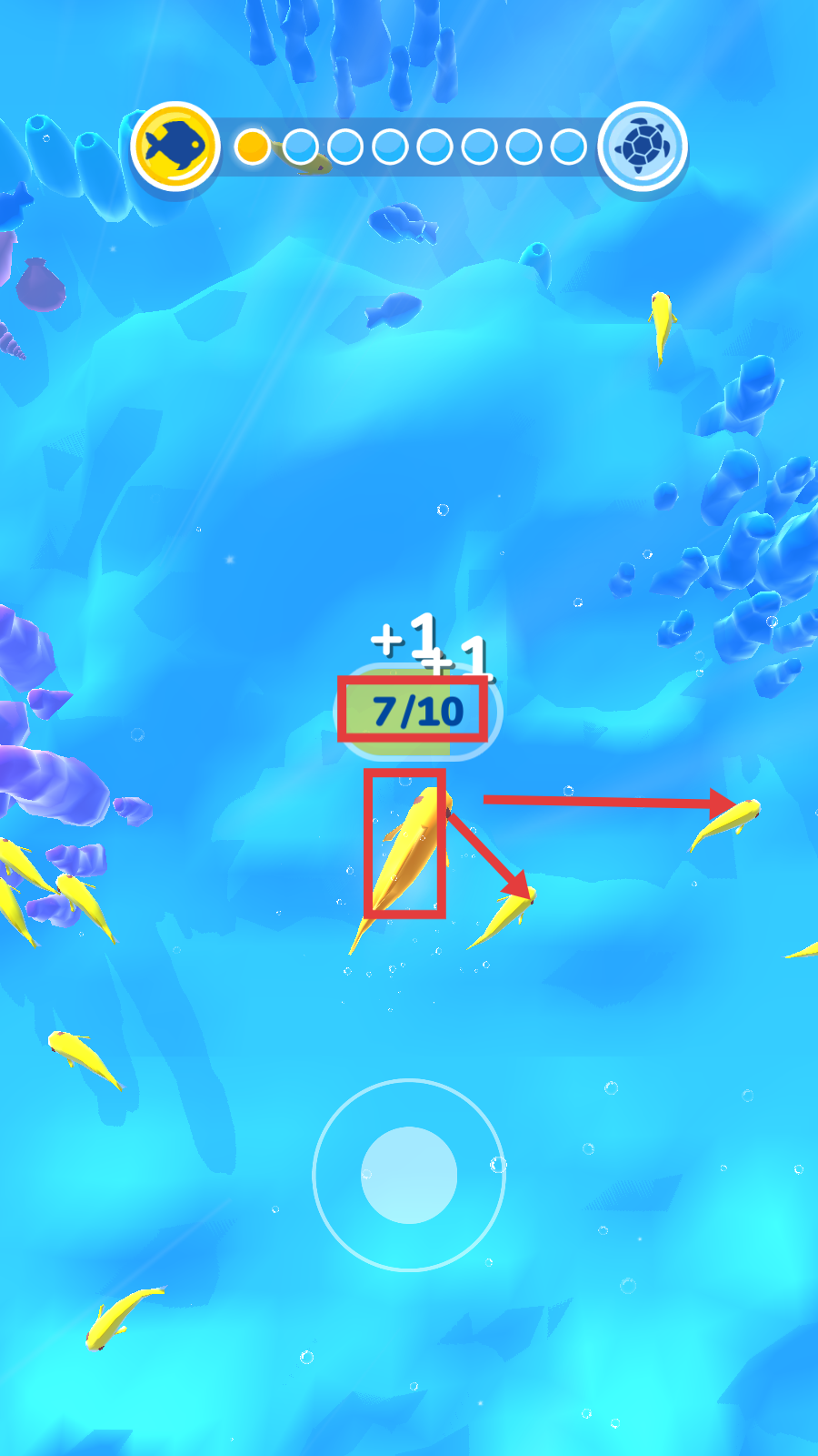 2、持续移动角色,瞄准附近黄色小鱼,快速叠加数量,推进【7/10】收集进度。