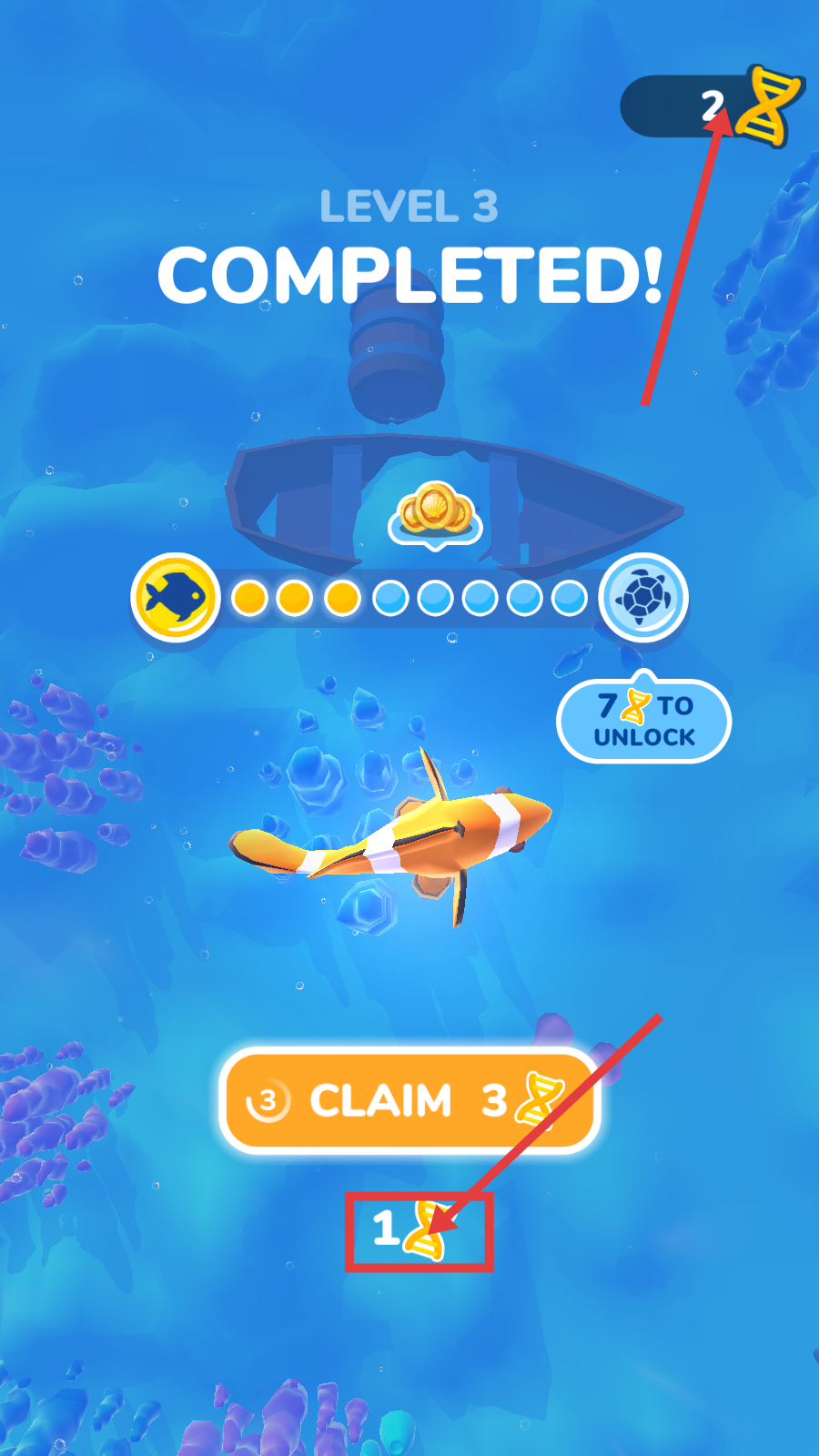 4、通关后领取【CLAIM-3-DNA】奖励,积累DNA,关注界面【DNA】解锁进度提示。