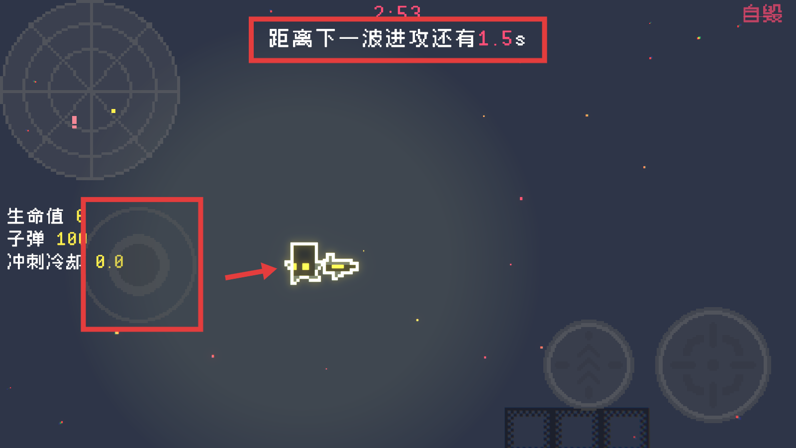 2、关注【距离下一波进攻还有1.5s】倒计时,同步确认【生命值-子弹-冲刺冷却】状态,做好迎敌准备。