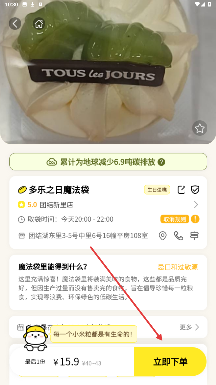 3、看中商品点详情,确认取袋时间、地址,点击【立即下单】锁定优惠。