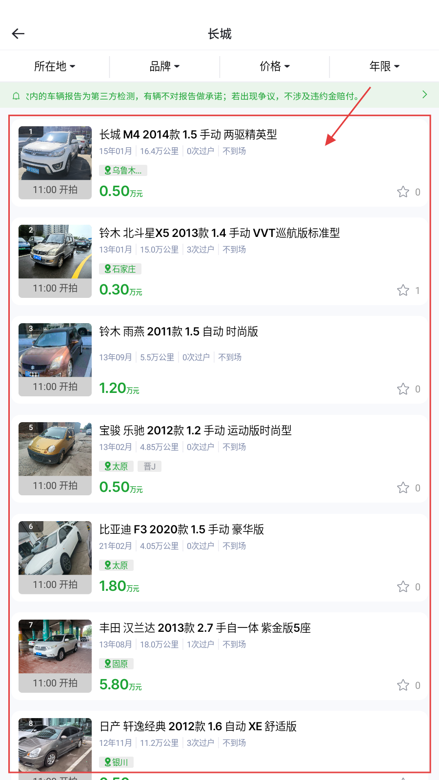2、在车源列表,按品牌(如长城)筛选,查看车辆基础信息选目标车。