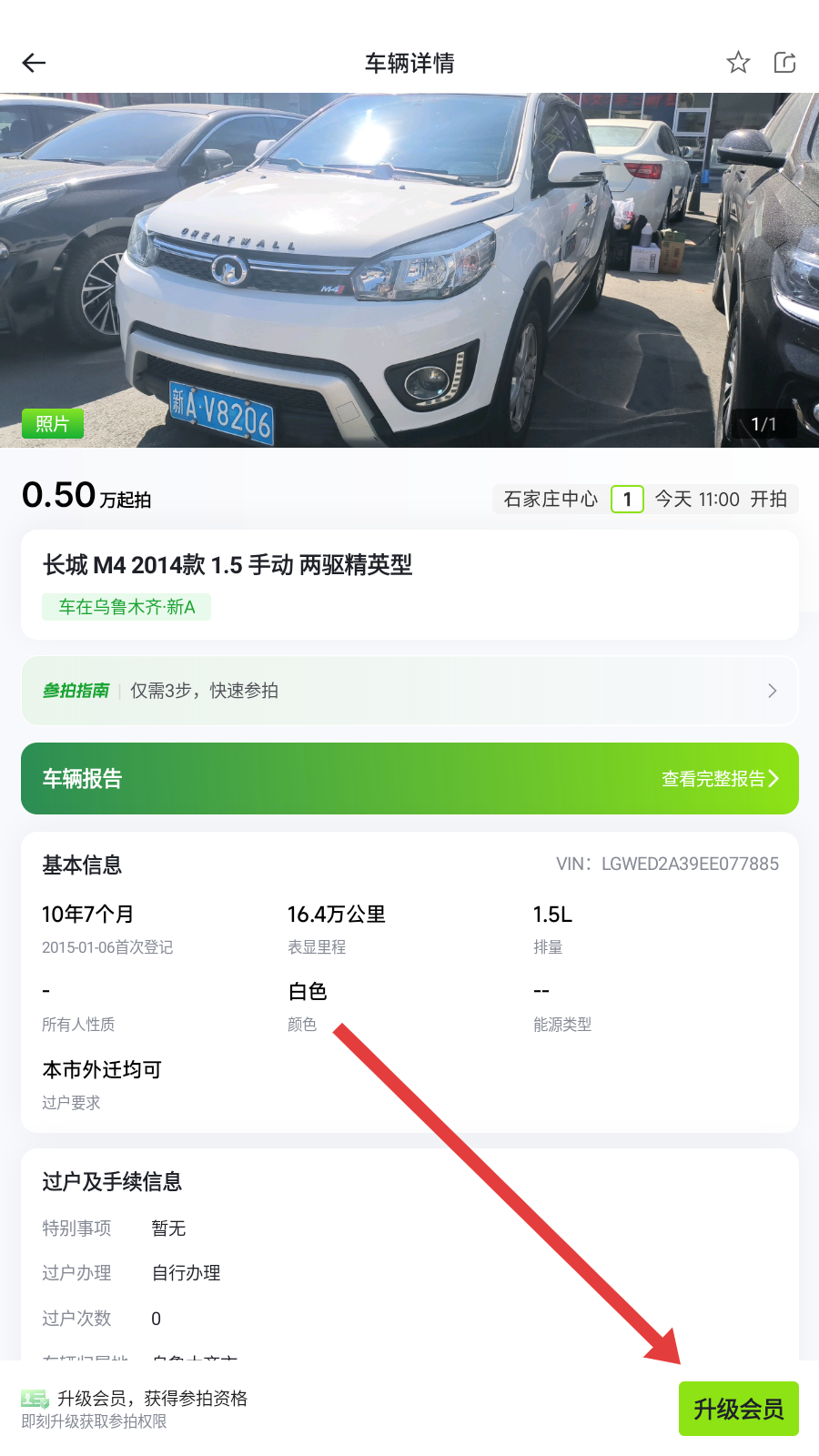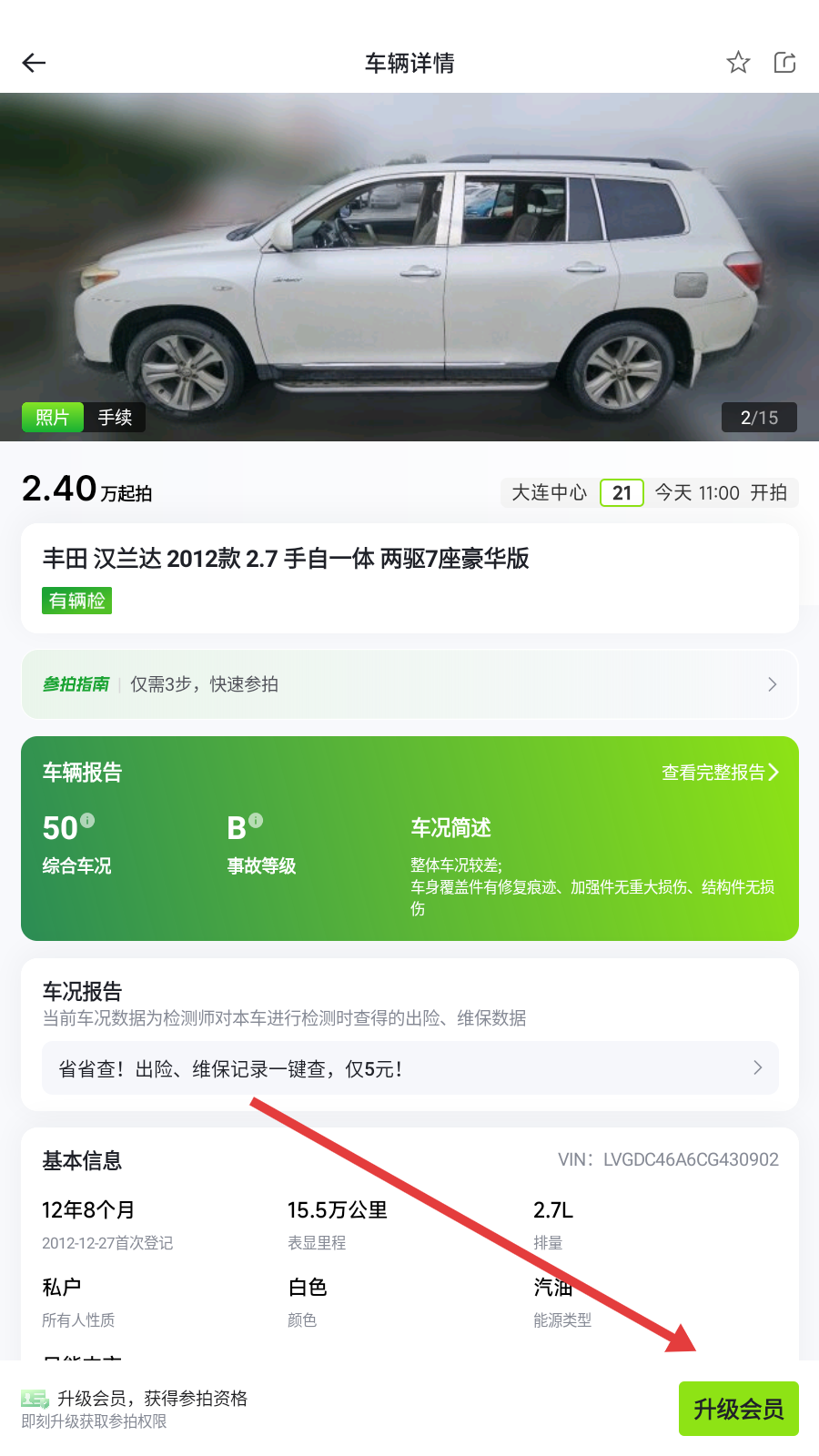3、进入车辆详情页,了解车况(如公里数-颜色),点【升级会员】解锁参拍。