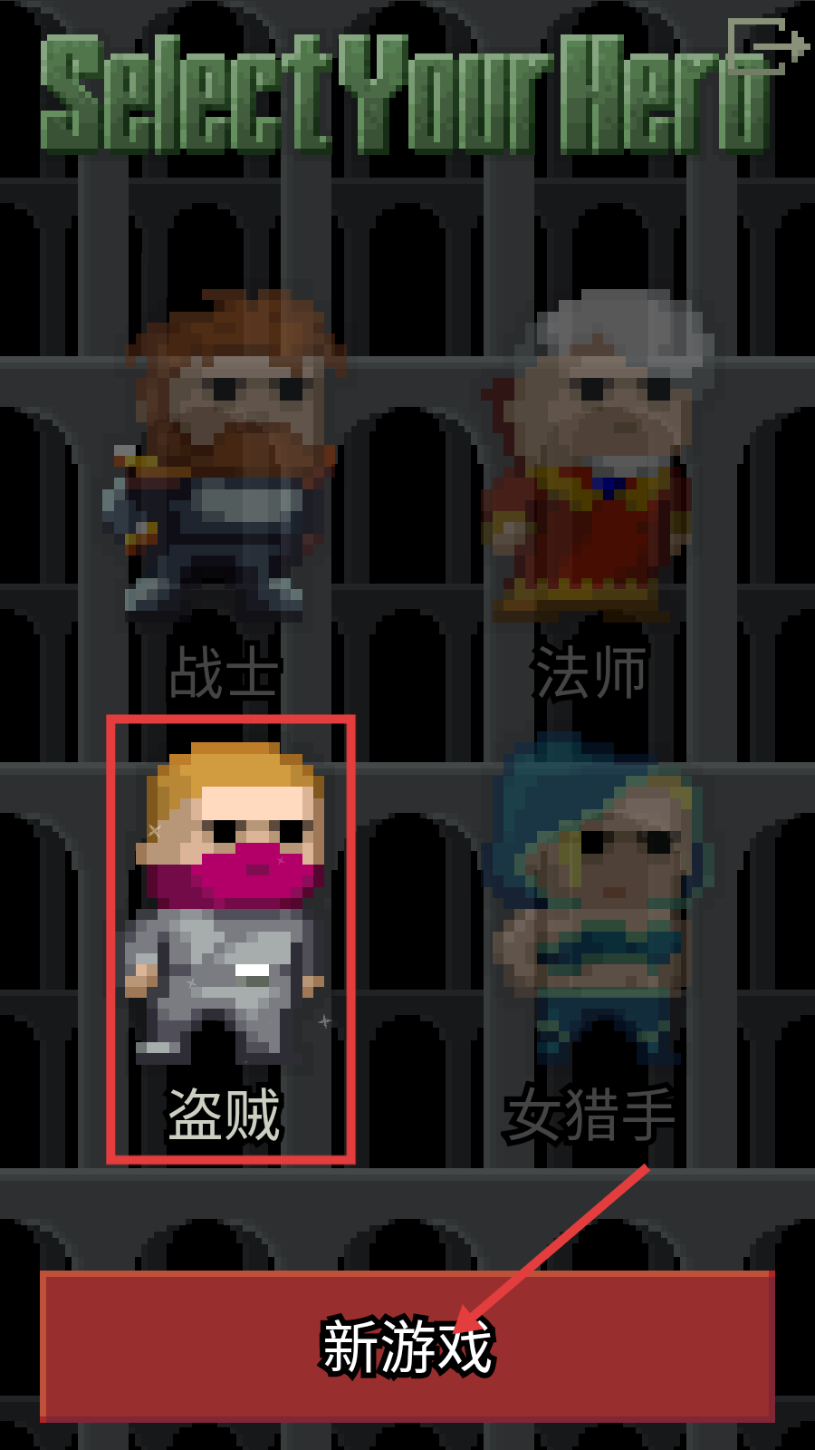 1、选择【盗贼】角色,点击【新游戏】,正式开启像素地牢的冒险之旅。