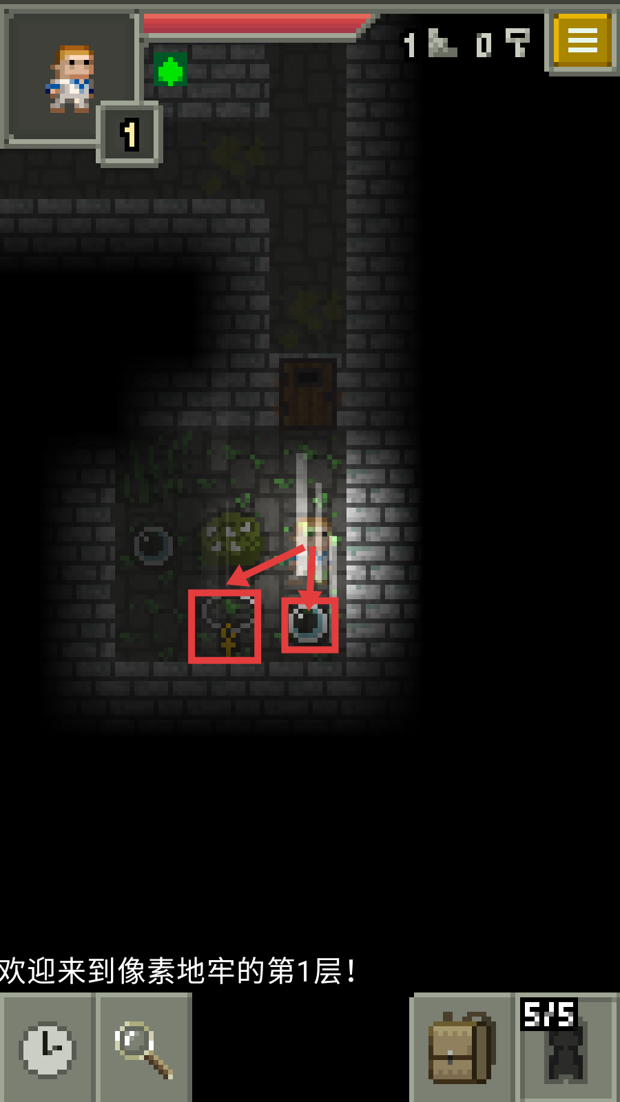 2、进入像素地牢第1层,优先拾取场景中的【武器】和【道具】,储备冒险资源。