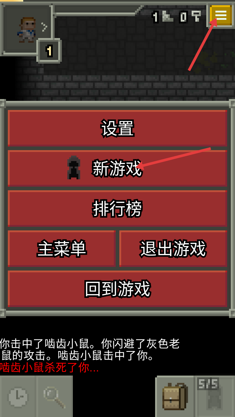 4、若挑战失败,点击右上角菜单,选择【新游戏】,重新开启地牢冒险征程。