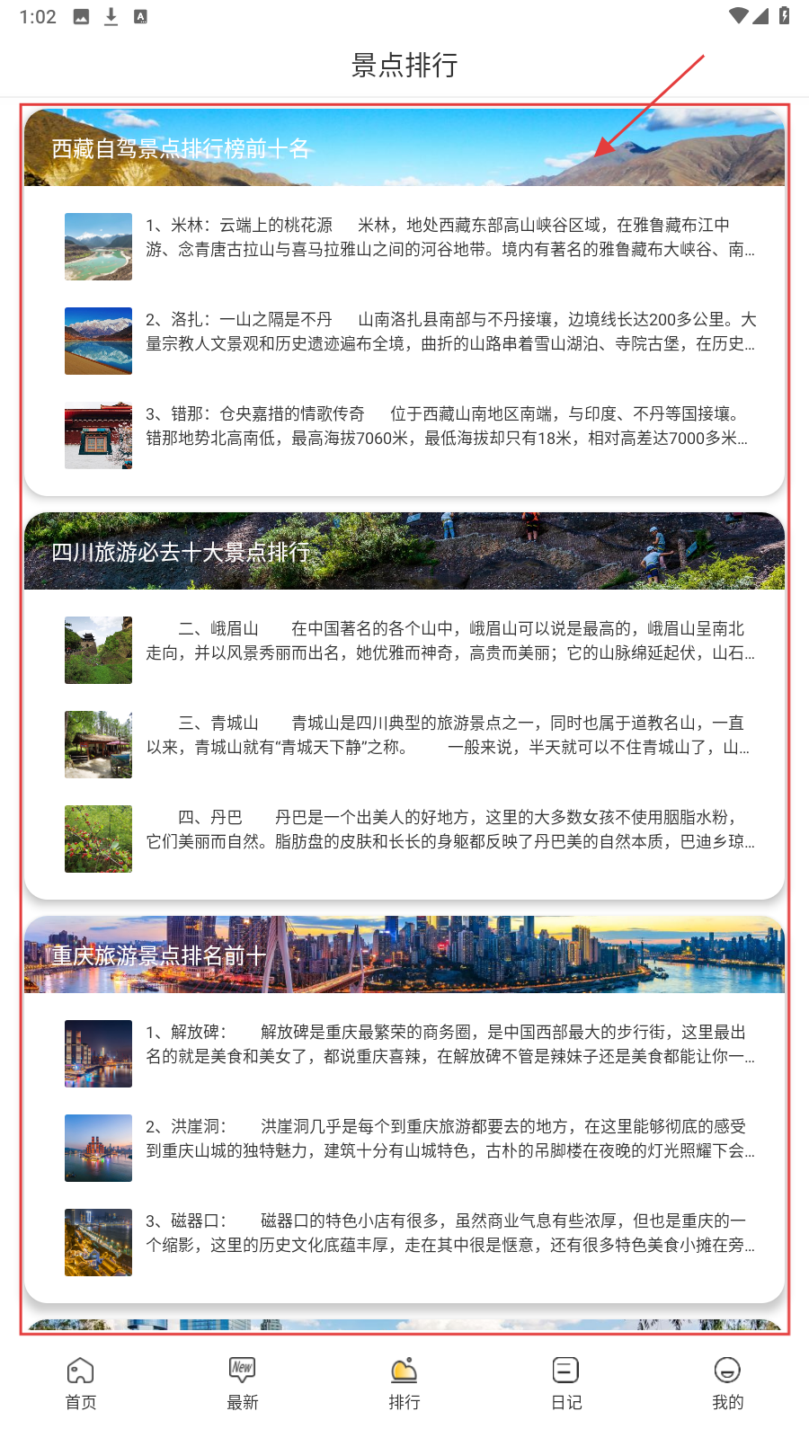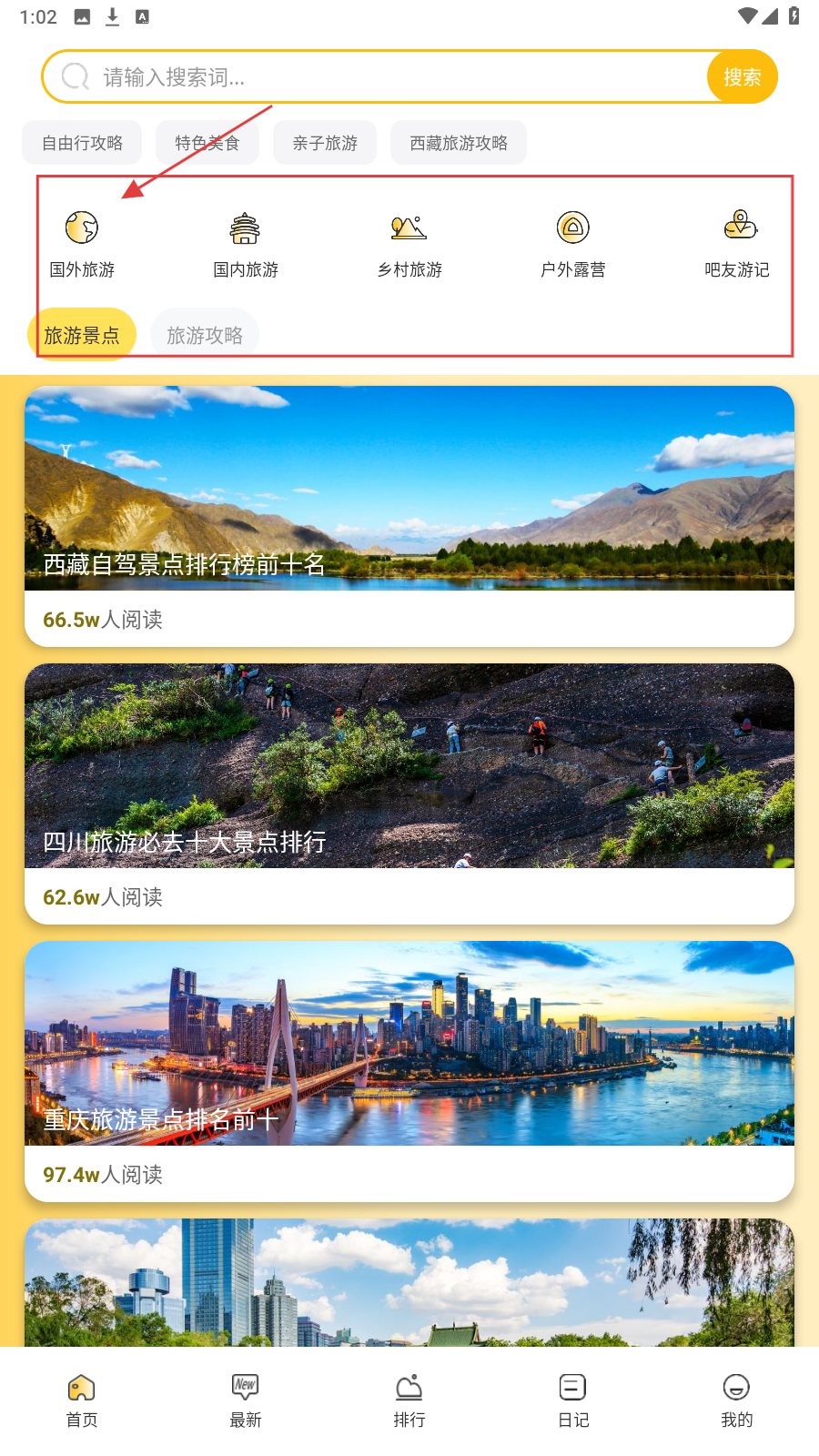 4、点【排行】,看“西藏自驾”“四川旅游”等景点排行,选热门地参考游玩。