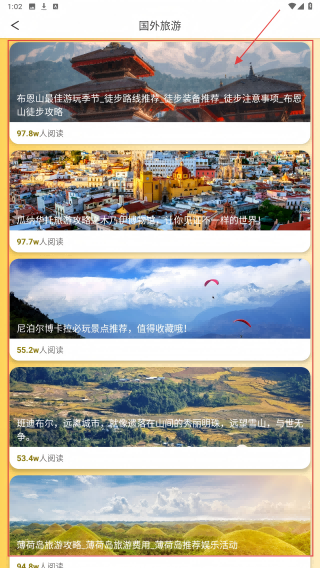 2、进入【国外旅游】,选“布恩山徒步攻略”等内容,点进详情了解玩法。