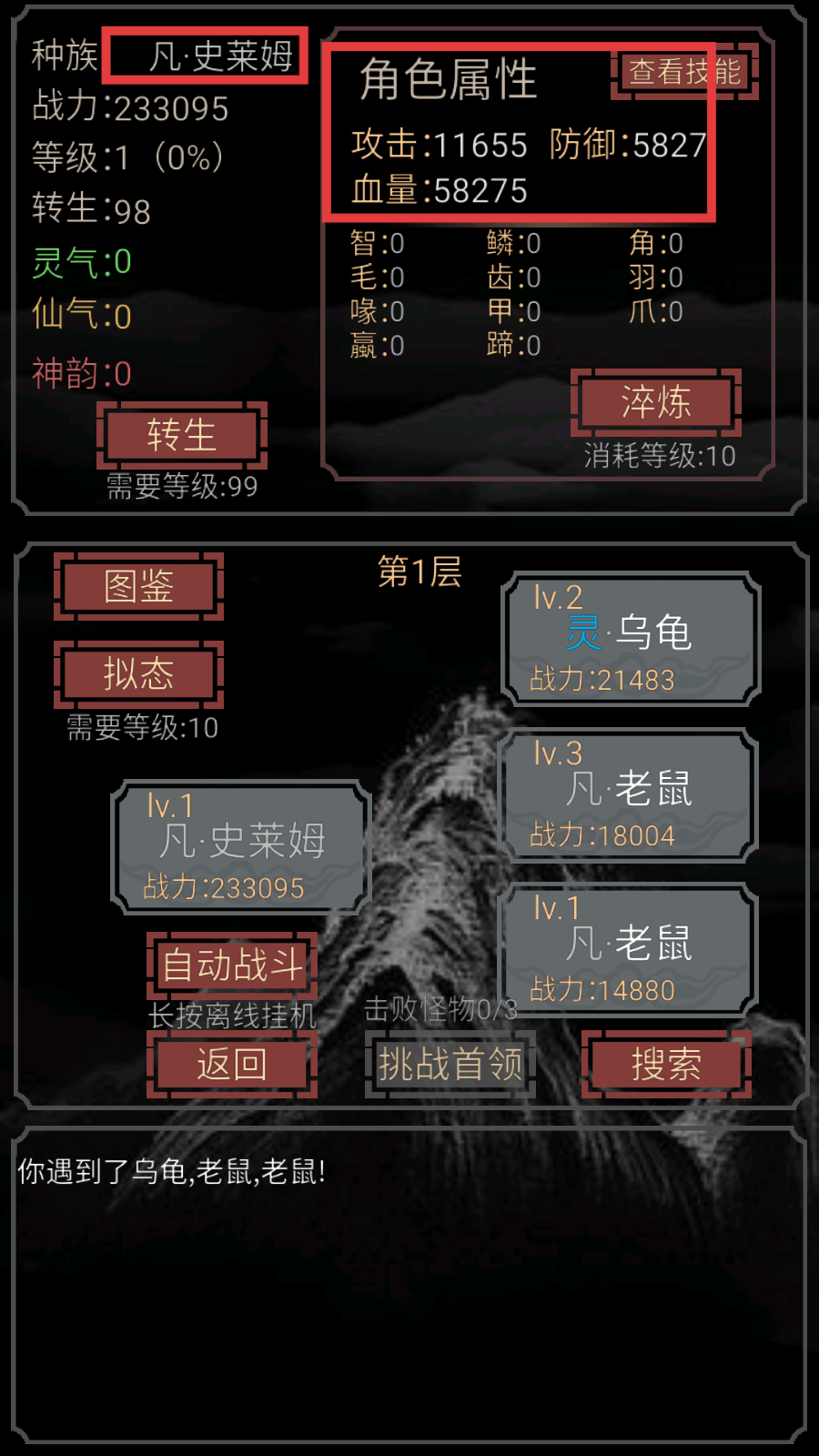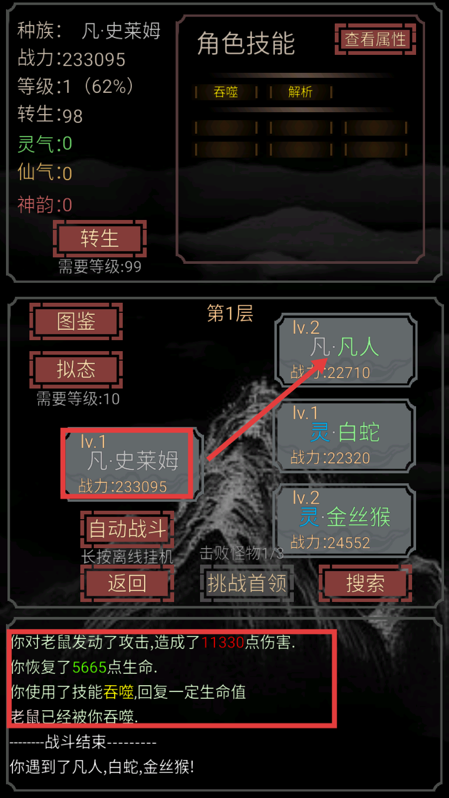 4、层级挑战推进:需要亲自击败各层级BOSS解锁新拟态形态,如105层孙悟空挑战可获得顶级战力。
