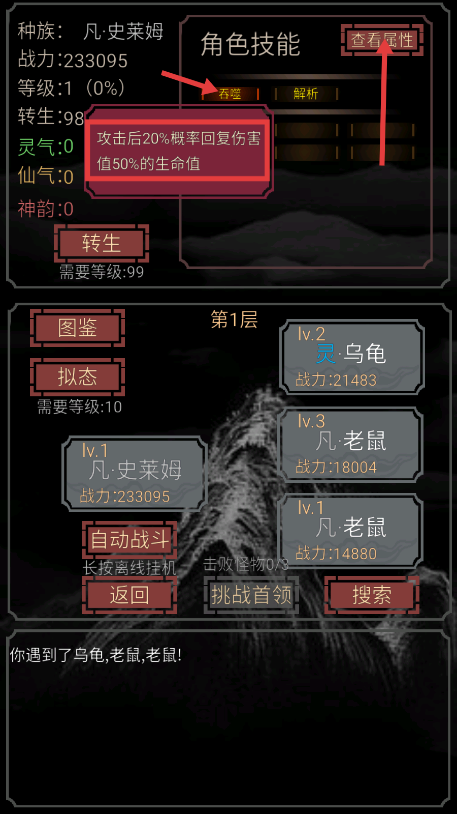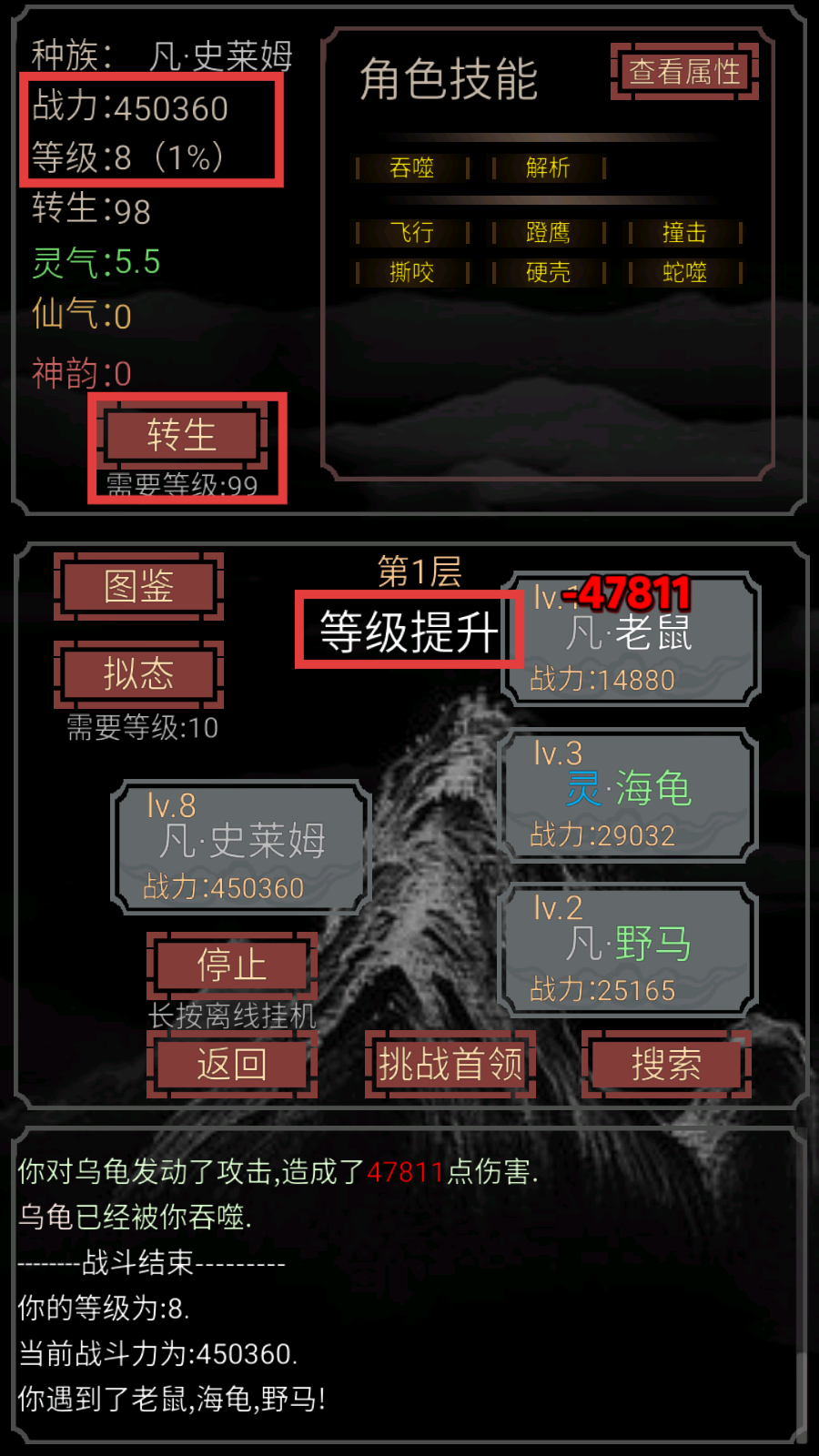 1、形态自由蜕变:通过击败不同种族敌人解锁拟态系统,可从基础史莱姆进化为真龙、孙悟空等神话存在,体验形态变化的乐趣。
