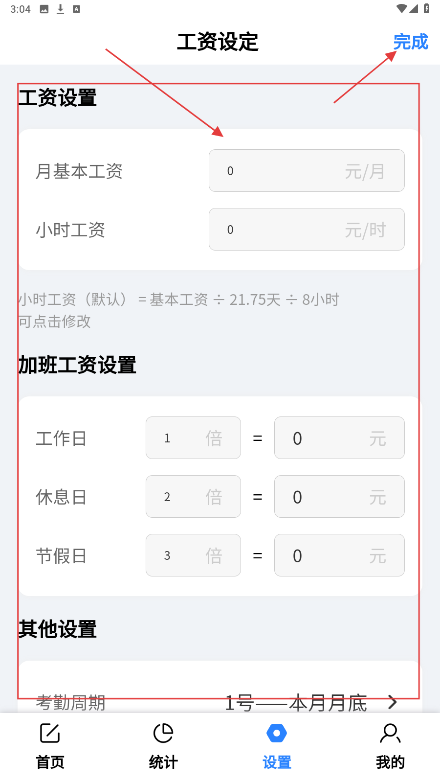 1、进入【工资设定】,填写【月基本工资】【小时工资】及加班工资等,点【完成】保存设置。