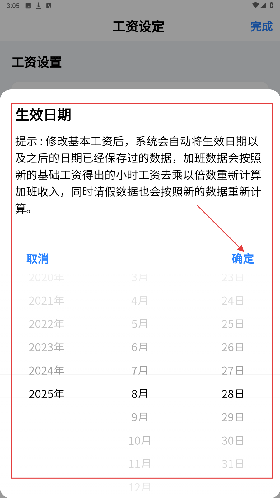 2、修改基本工资后,选生效日期,确认规则后点【确定】应用新工资计算。