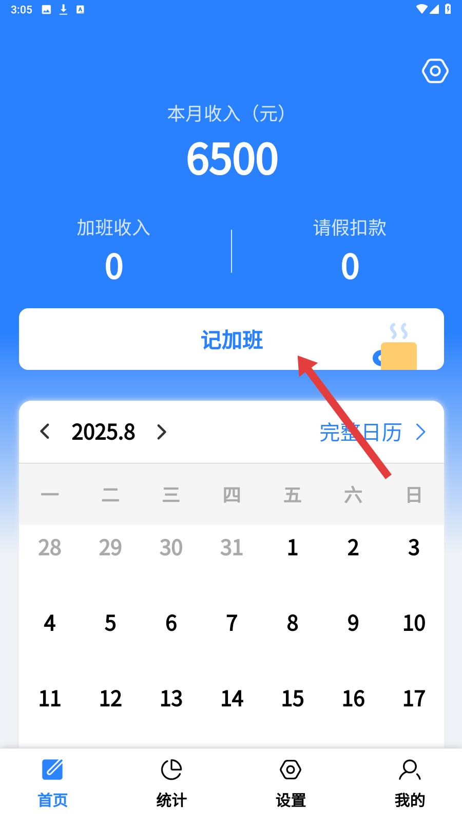 3、在收入页面,若有加班,点击【记加班】按钮,开始录入加班信息。