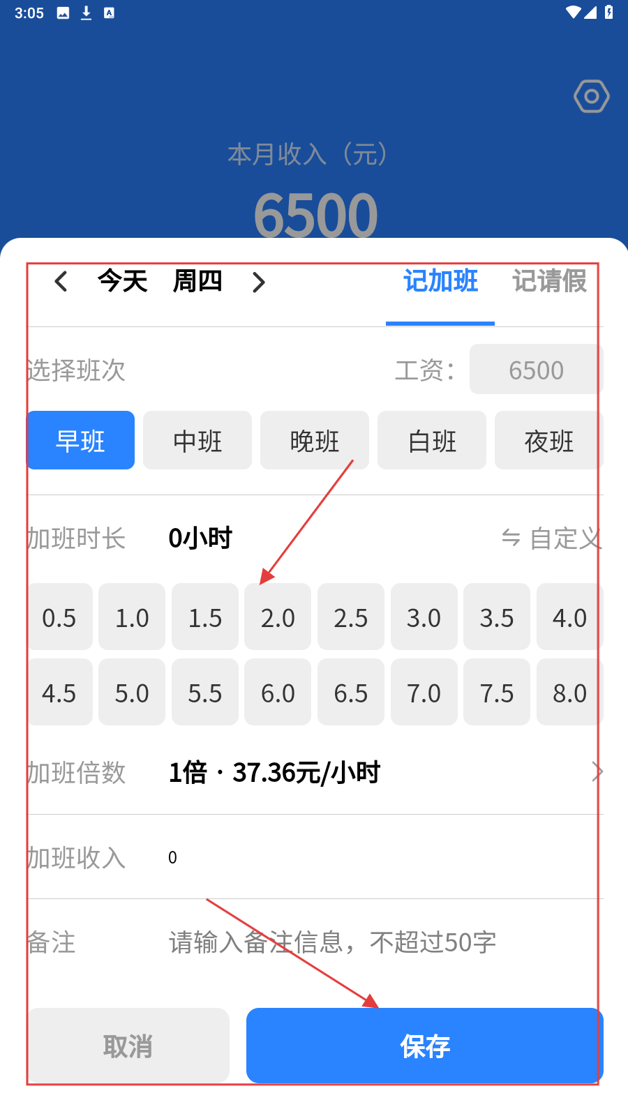 4、选班次,设加班时长、倍数,填备注后点【保存】,记录加班收入。