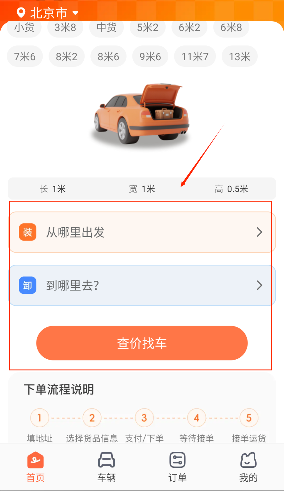 3、选定车型后需要准确填写取货和送货地址,支持地图定位和手动输入两种方式,地址确认后不可随意更改。