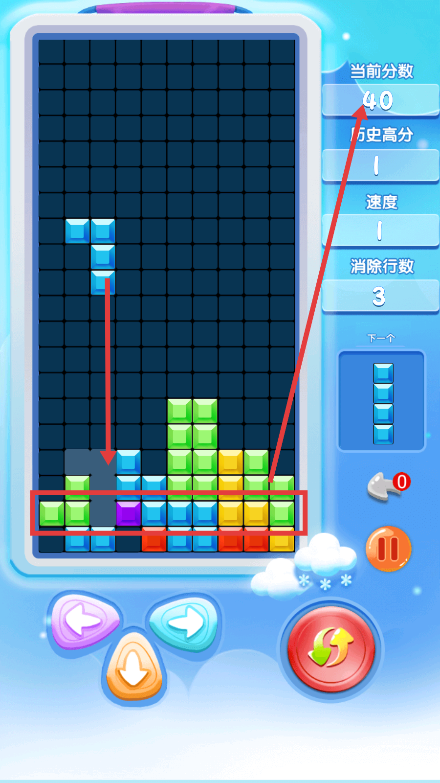 3、堆砌时凑满整行消除-通过【消除行数】涨【当前分数】-维持合理布局防堆积。