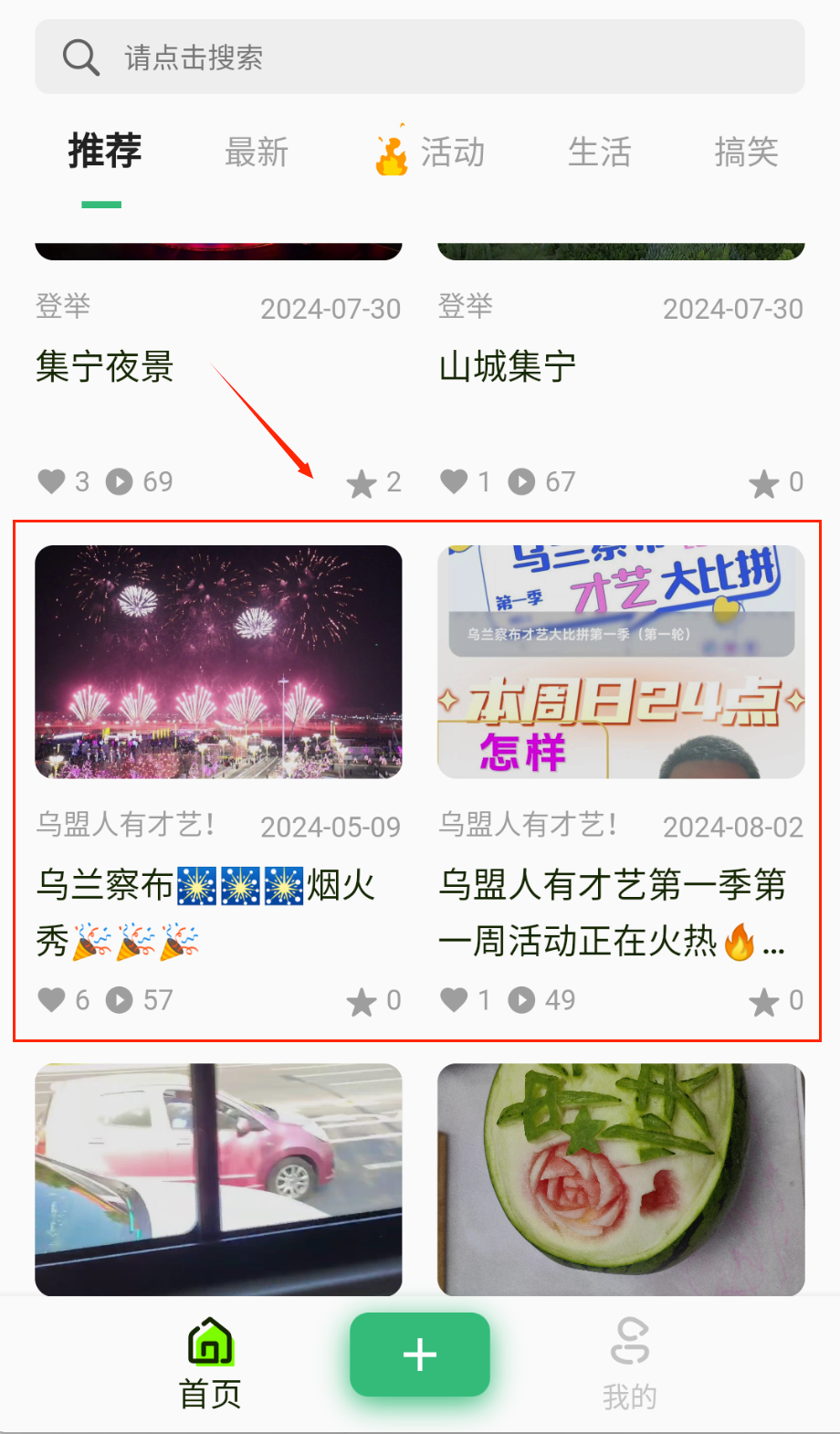 2、在首页浏览推荐内容时,可以通过滑动屏幕查看不同类型的才艺展示和生活资讯,每个内容卡片都标注了点赞数和评论数。