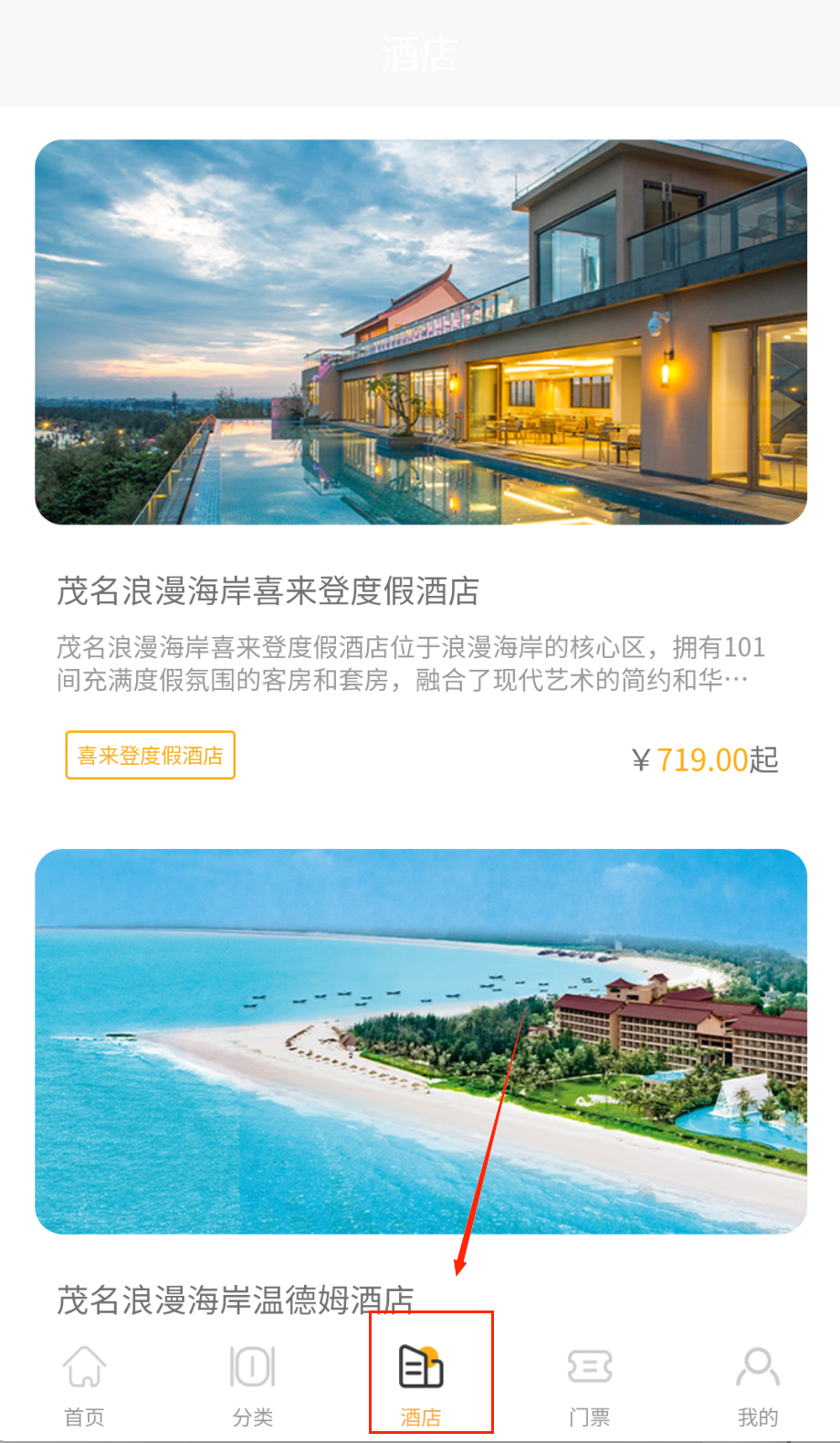2、在首页搜索框输入目的地名称和出行日期,系统会显示该地区的酒店推荐列表和景区信息,包括价格、评分和用户评价等详细数据。