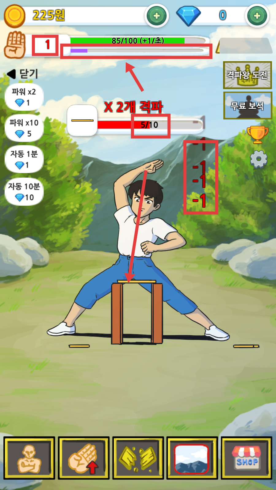 2、劈砖时关注【85/100-体力】变化,推进至【5/10-劈砖】,获取【225-金币】提升资源。