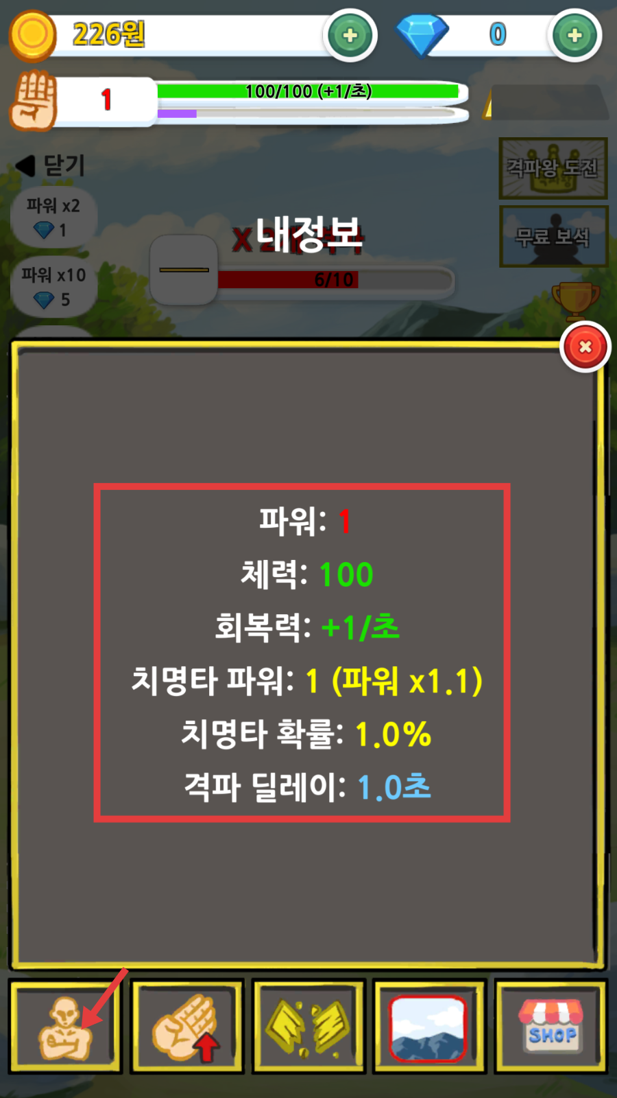 3、点击升级按钮,消耗【1000-金币】提升【力量】【体力】等属性,强化战斗能力。