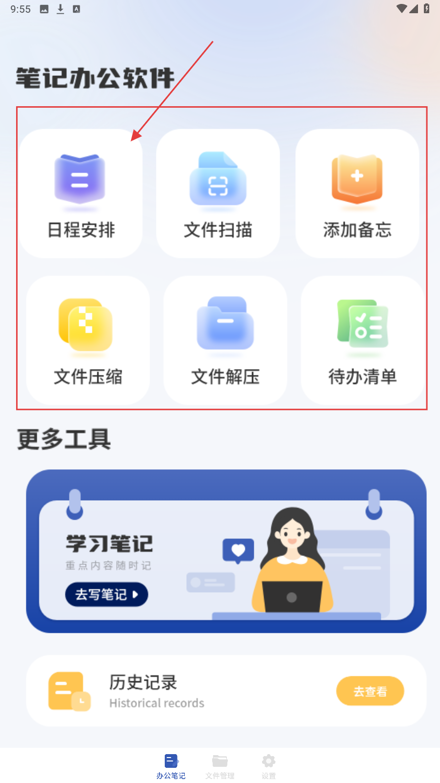 1、打开【笔记办公软件】,点击【日程安排】,进入日程管理页面。
