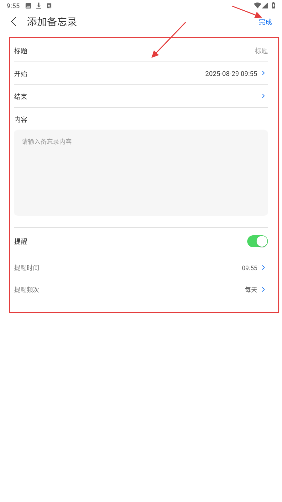 3、填写【添加备忘录】的标题、时间、内容等,点【完成】保存。