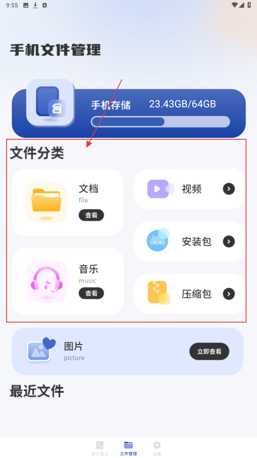 4、进入【手机文件管理】,按需点【文件分类】里的类型,管理文件。