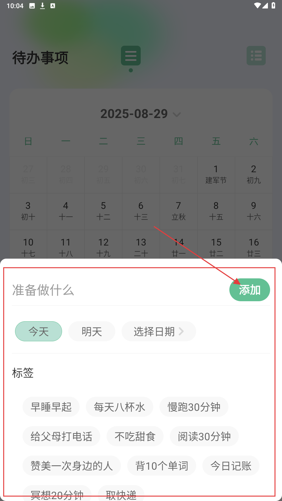 2、填【准备做什么】内容,选日期、标签,点【添加】存待办。