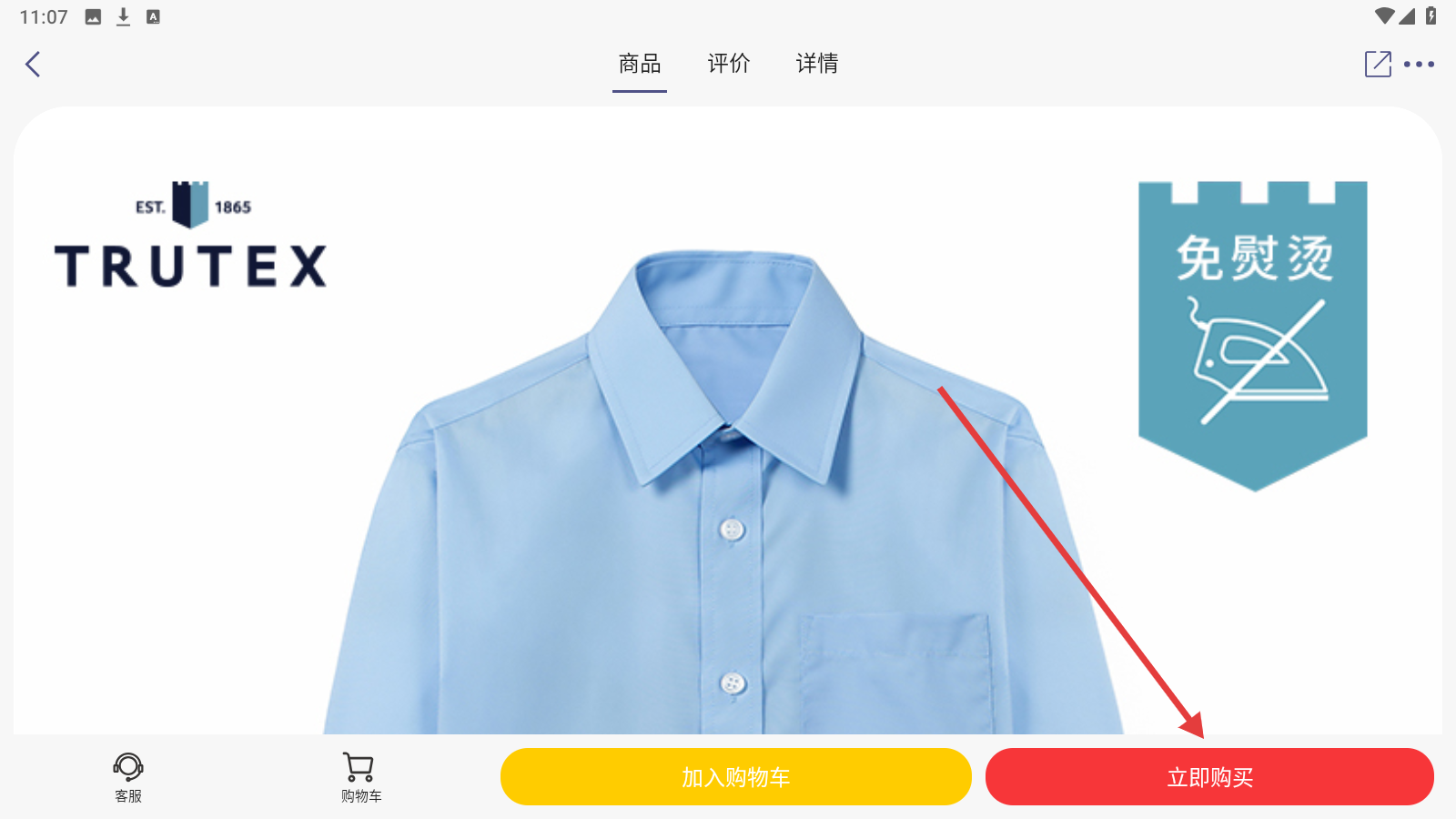 4、进入商品详情页,点【立即购买】,完成校服衬衫下单流程。