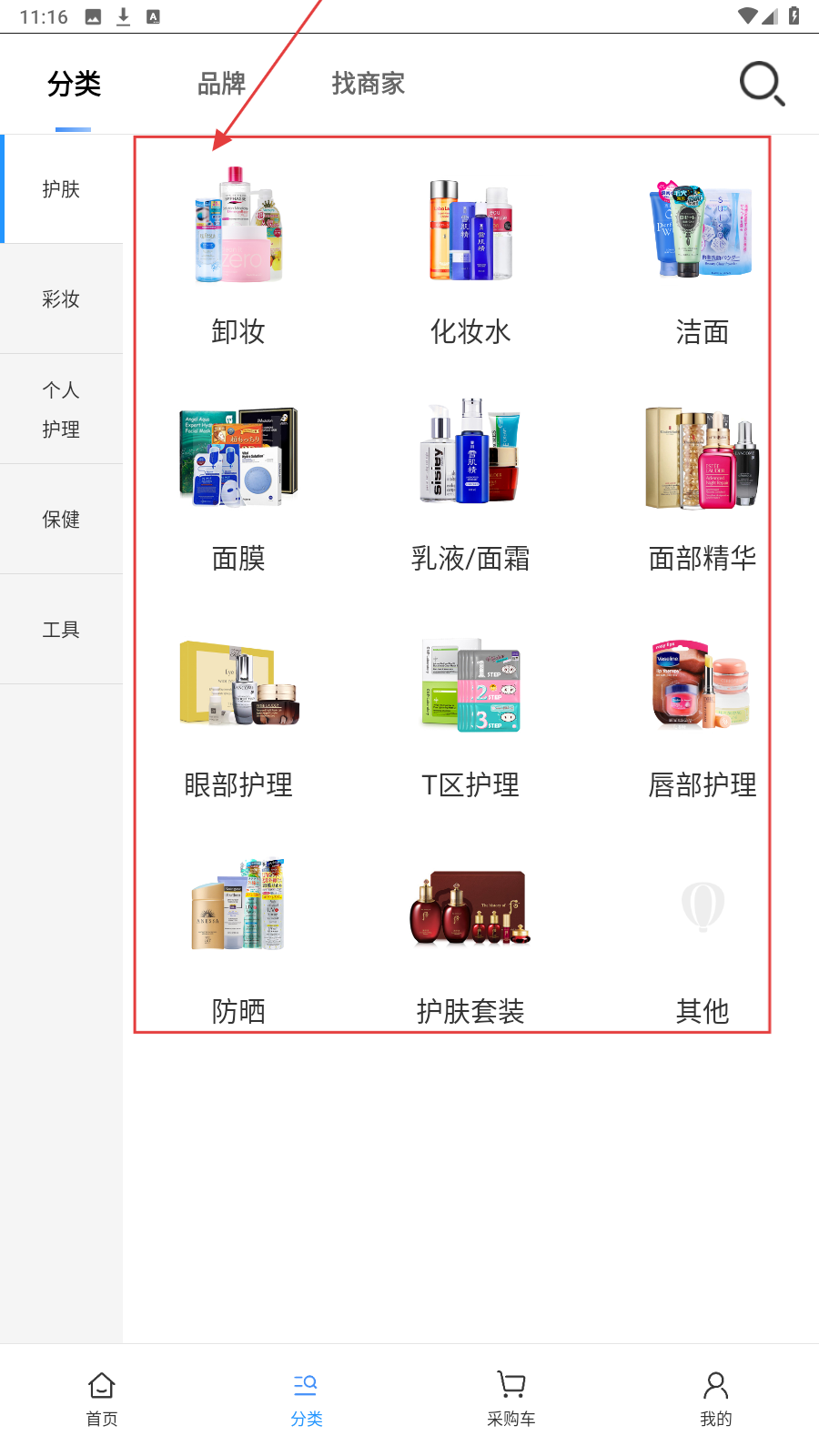 1、进入分类页,选护肤分类下的细分品类,如【卸妆】,浏览相关商品。