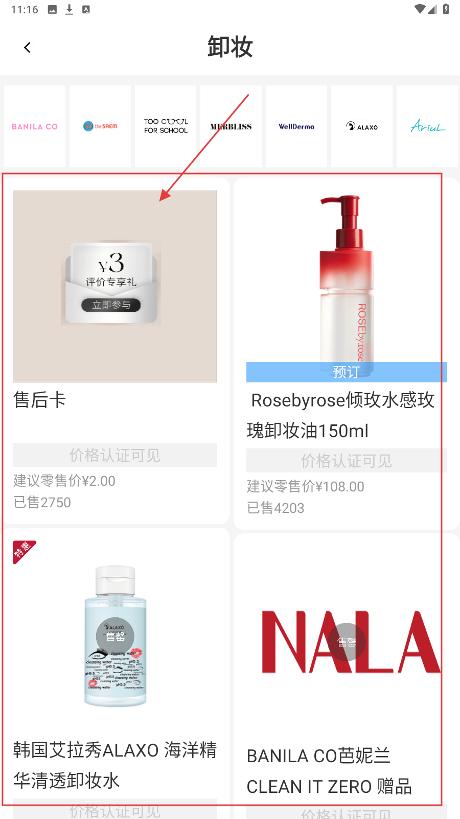 2、在【卸妆】品类页,查看商品,像【售后卡】【玫瑰卸妆油】等,按需选择。