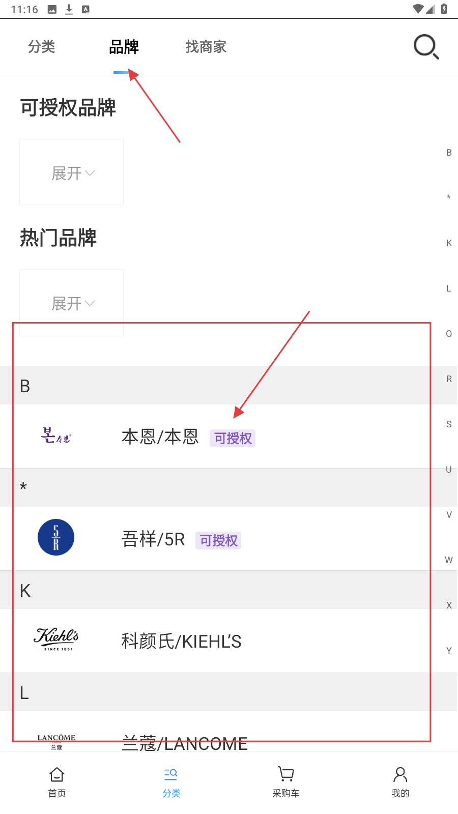 3、切换到【品牌】页,浏览热门品牌,选如【本恩】【吾样】等可授权品牌。