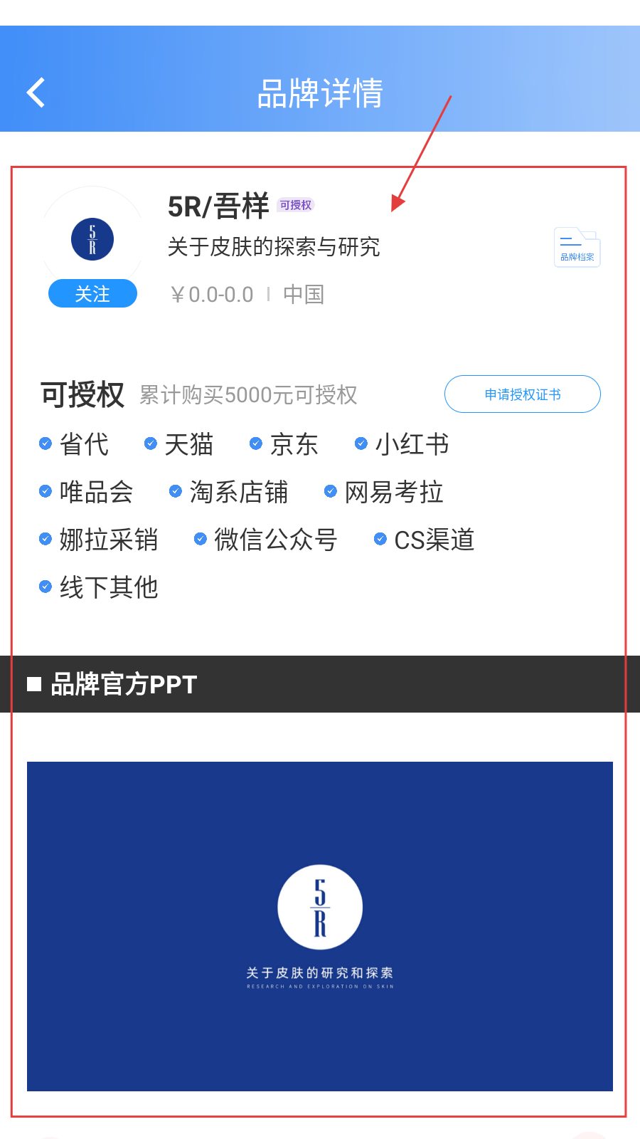 4、进入品牌详情页,了解【5R/吾样】授权条件、渠道,按需申请授权合作。