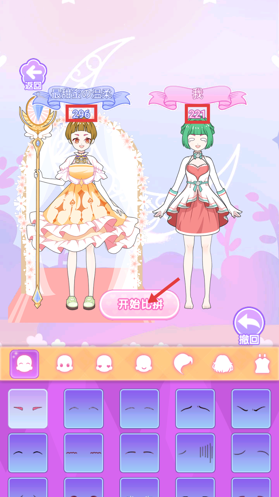 3、对比对手与自身分数,若差距大,先优化装扮,再点【开始比拼】,争取更高评分。