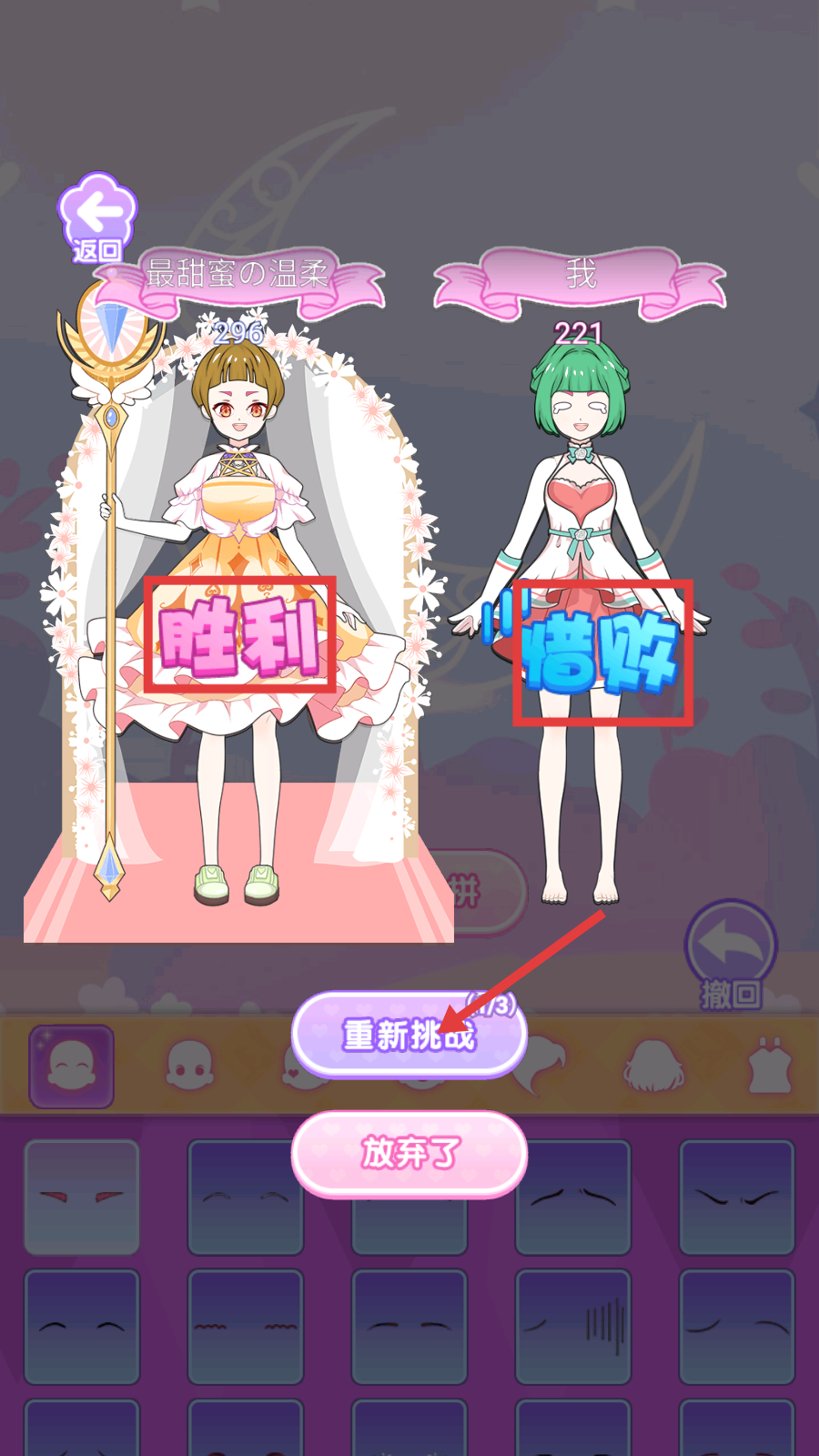 4、若显示【惜败】,别放弃,点击【重新挑战】,调整穿搭细节,提升分数战胜对手。