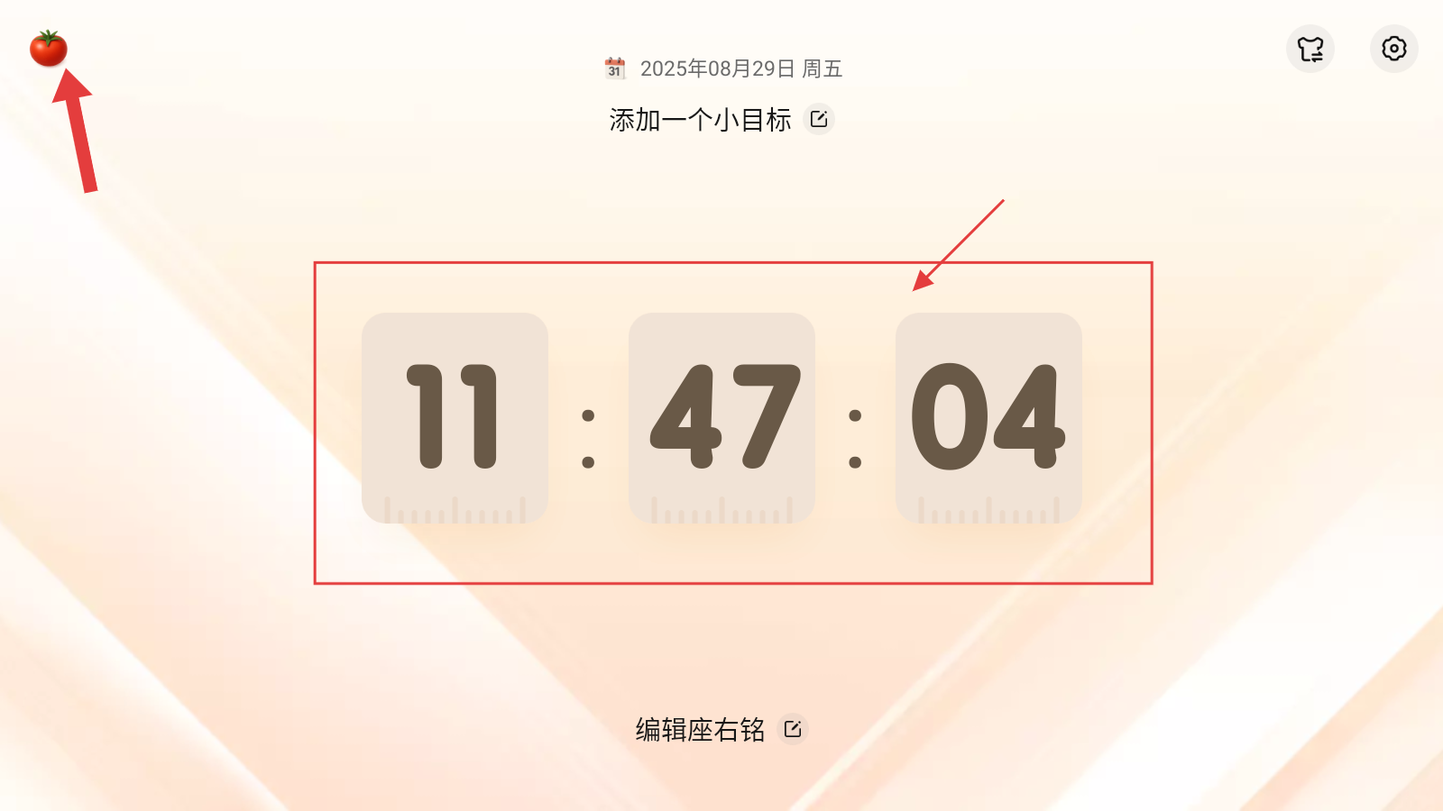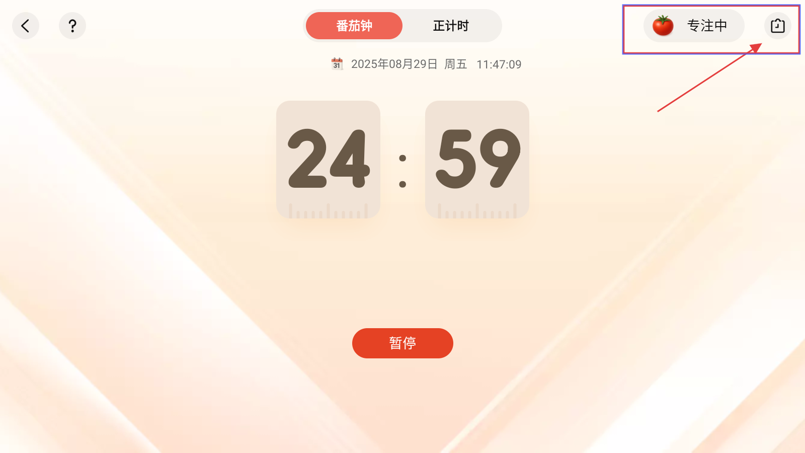 1、点击左上角番茄图标,进入专注计时功能,开启高效专注模式。