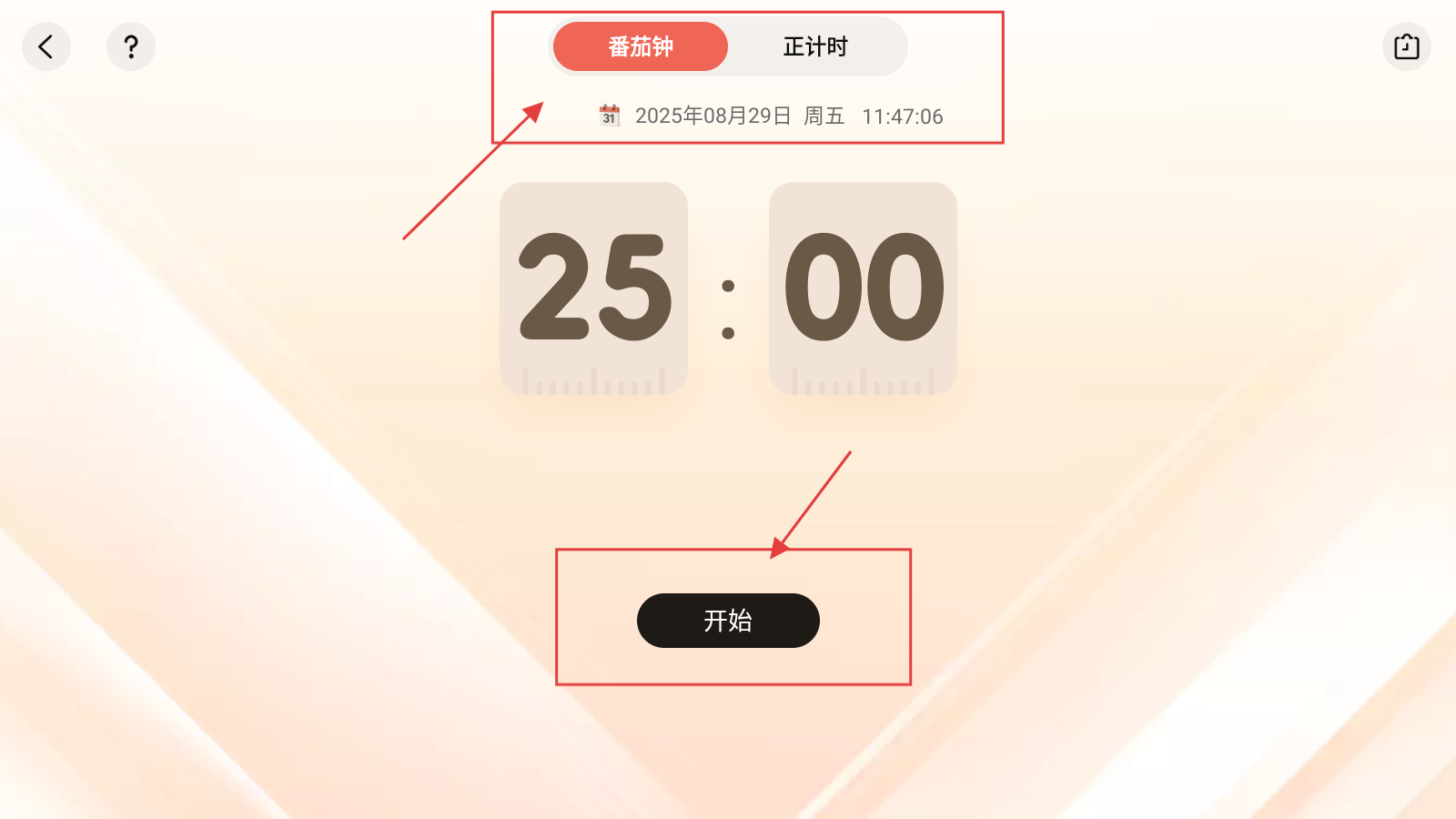2、在番茄钟界面,确认【番茄钟】模式,点击【开始】,启动25分钟计时。