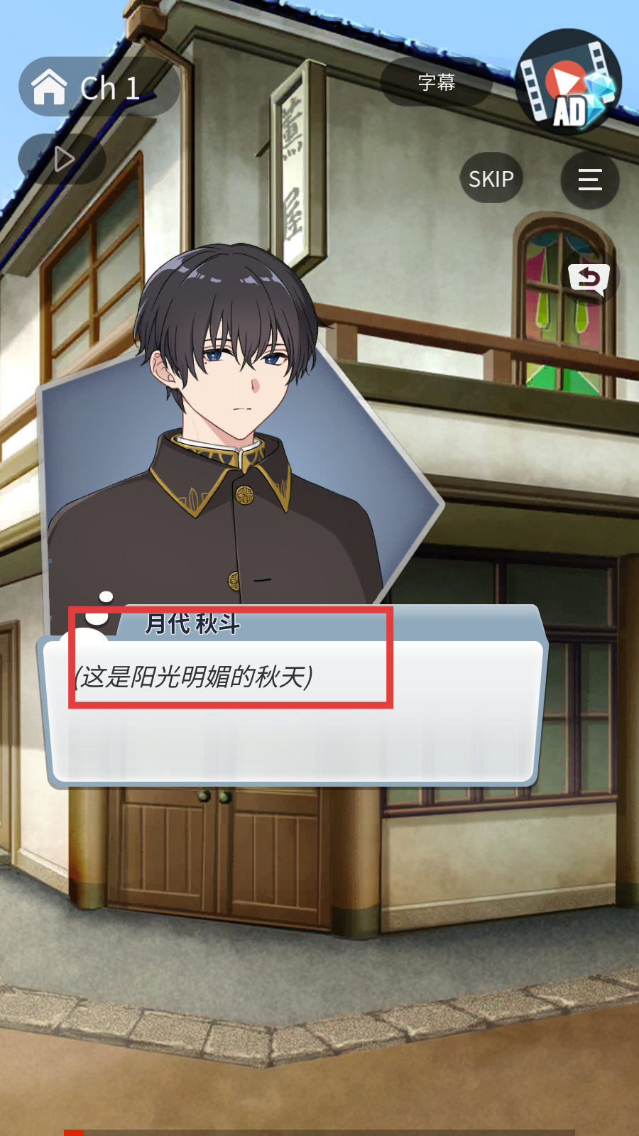2、进入剧情,跟随【月代秋斗】的【(这是阳光明媚的秋天)】描述,了解场景推进故事。