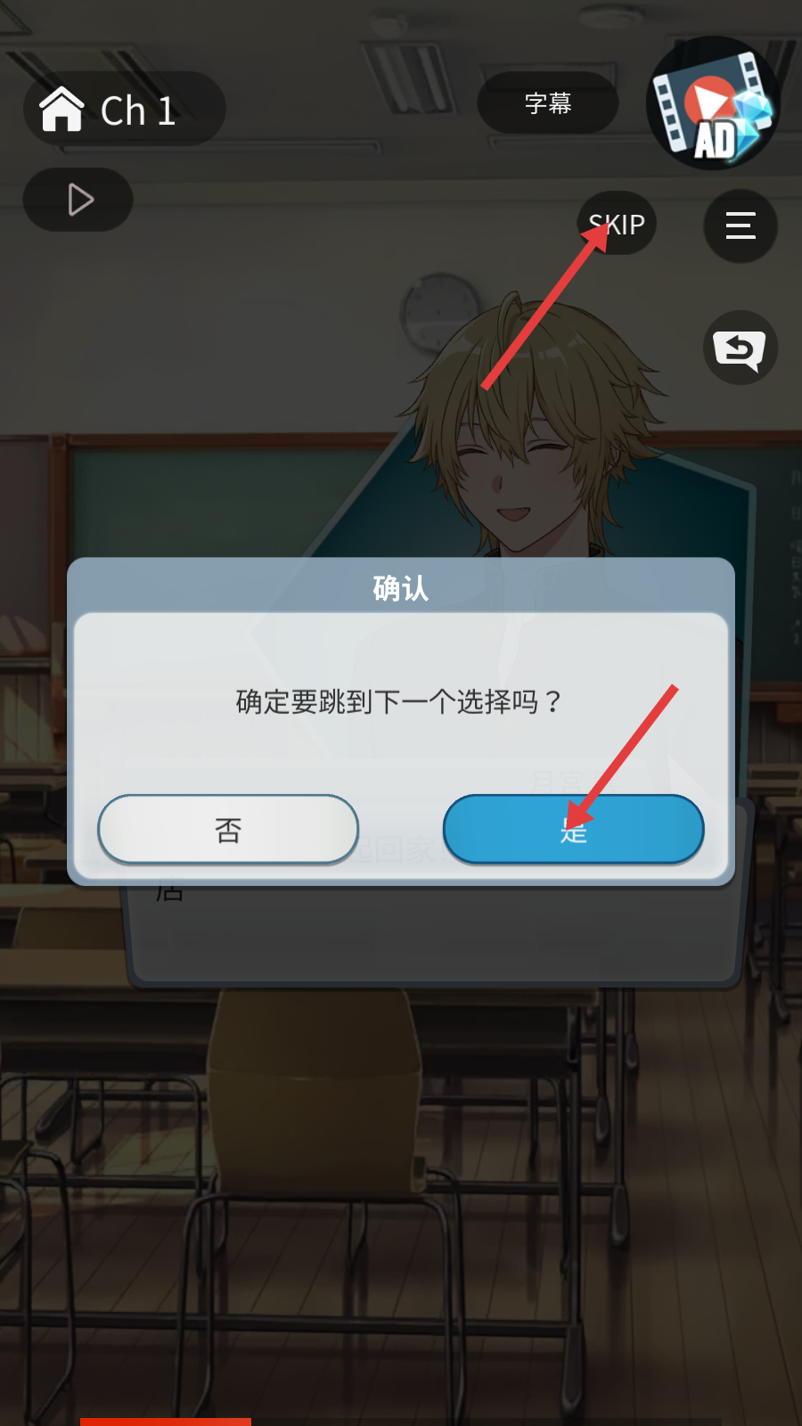 4、想快进点右上角【SKIP】,确认框选【是】,直接跳转至下一个选择节点。