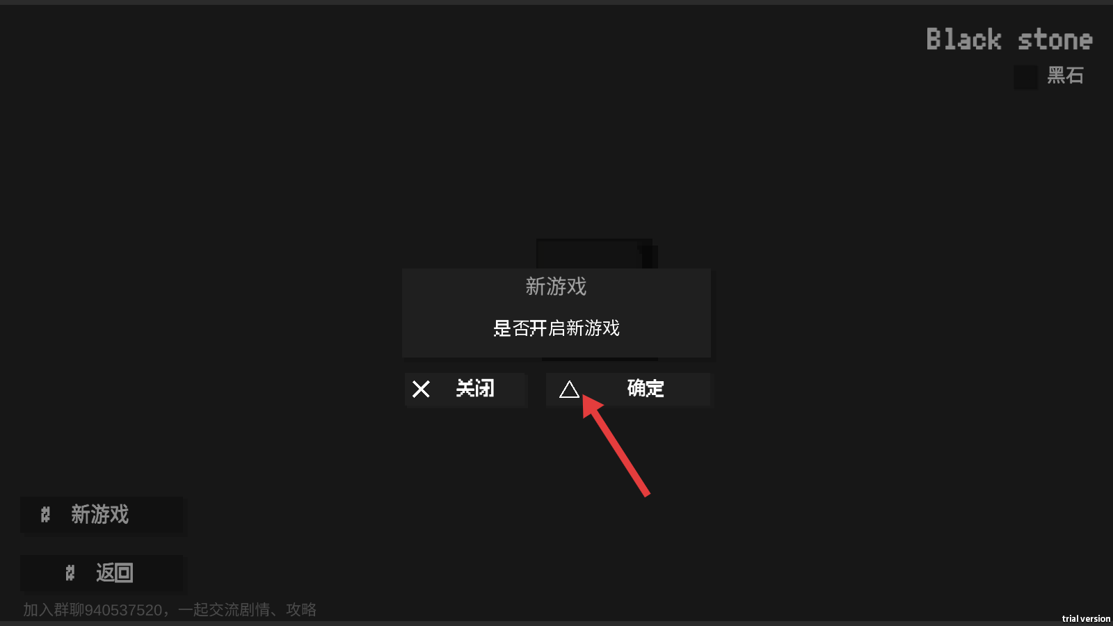 1、新游戏启动,弹窗选【确定】,正式开启《Black-stone》的冒险旅程,踏入未知剧情。