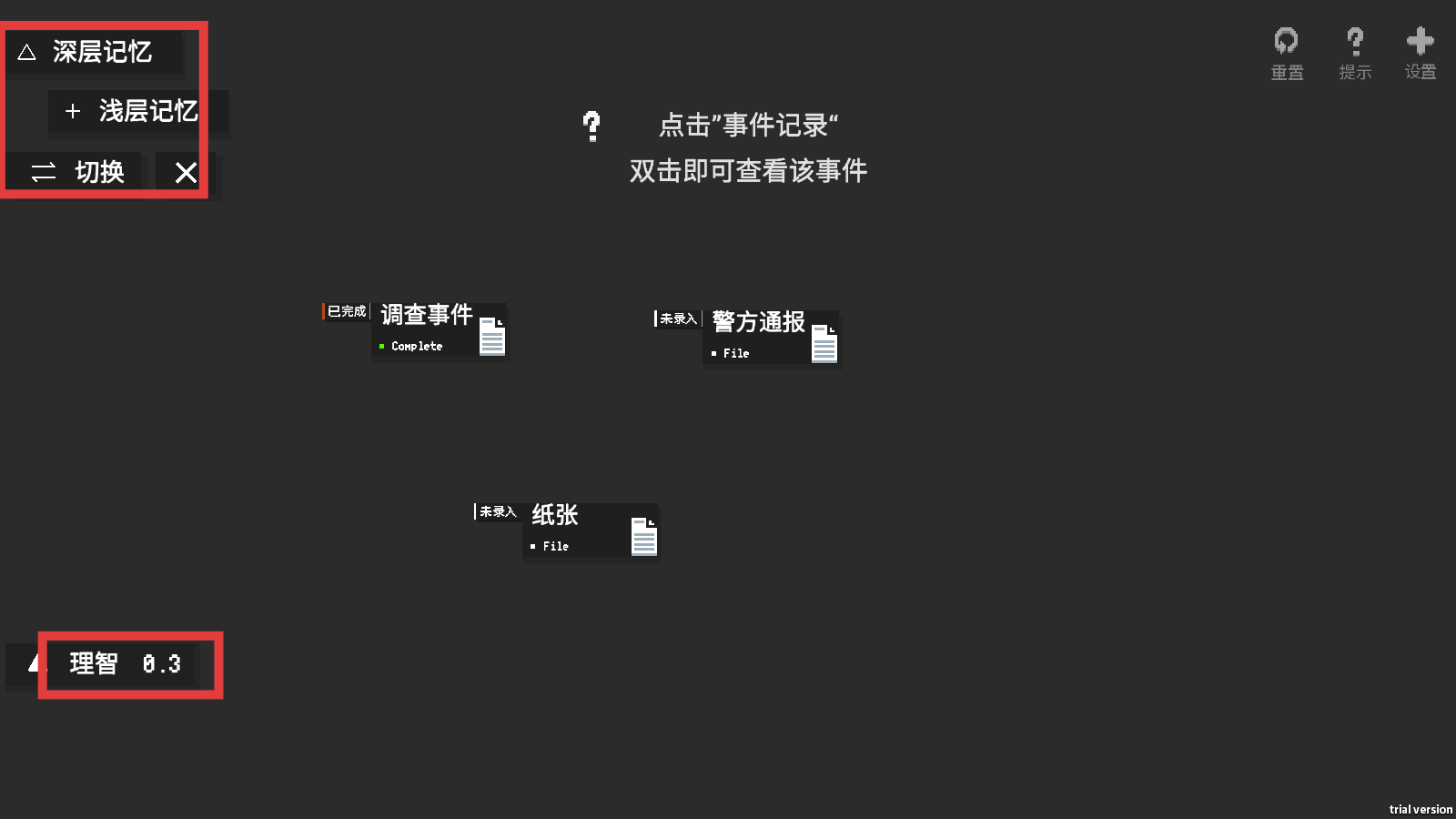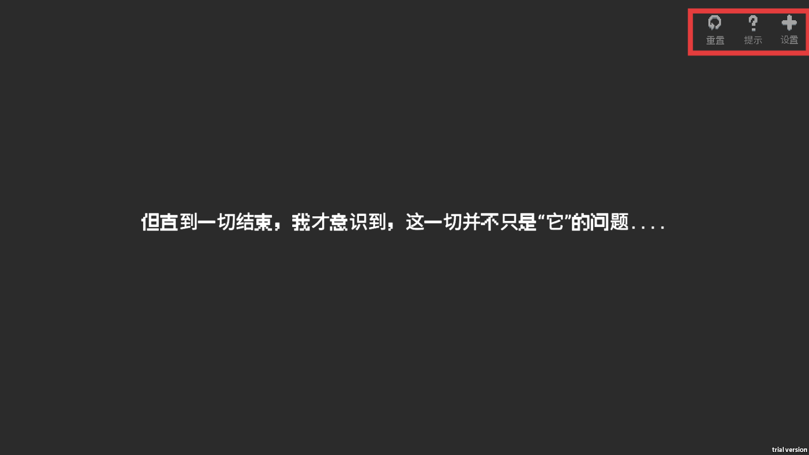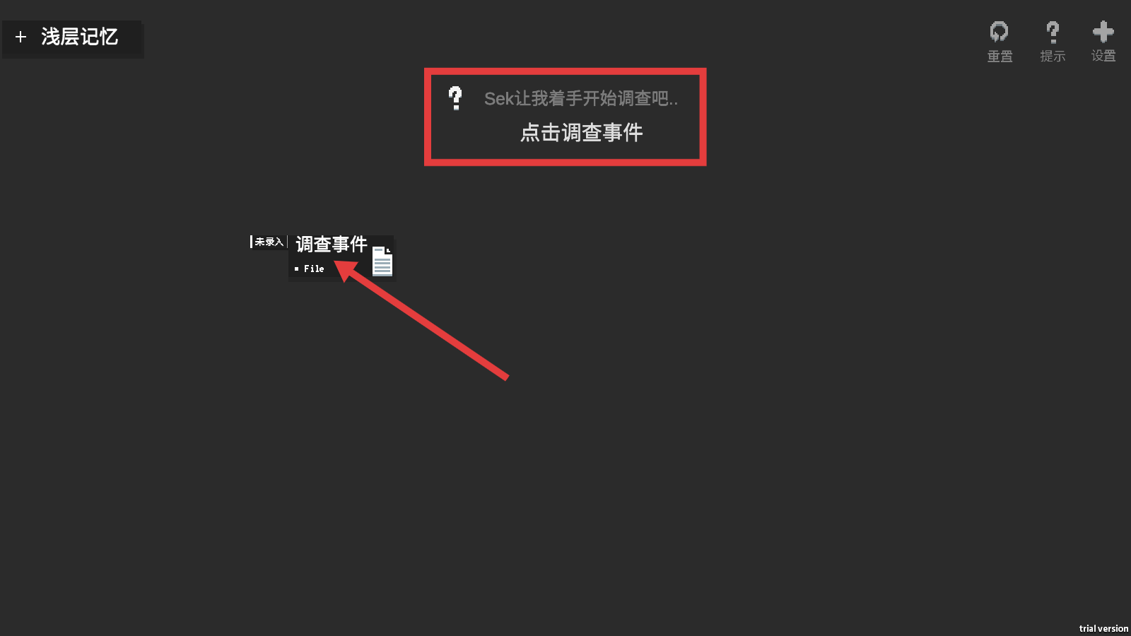 2、剧情界面留意右上角【重置-提示-设置】,遇难题点提示,辅助理解故事推进方向。